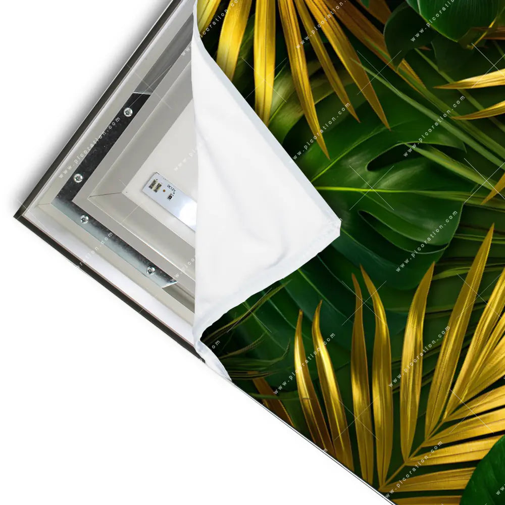 Das LED Wandbild mit dem Motiv Blätter Gold Grün der Kategorie Blumen - Botanik, Muster - Texturen ist ein besonders beeindruckendes Wandbild mit LED-Beleuchtung, denn Tropische Blätter in Gold wirkt durch die feinen LED´s hinter der textilen Oberfläche des Wandbildes noch intensiver und faszinierender auf den Betrachter. Unterstützt wird diese Wirkung des Wandbildes durch das Hochformat, welches in den Größen Maße zur Verfügung steht, um sich optimal an Ihre Wand anzuschmiegen und dem Raum ein neues Flair zu verleihen.