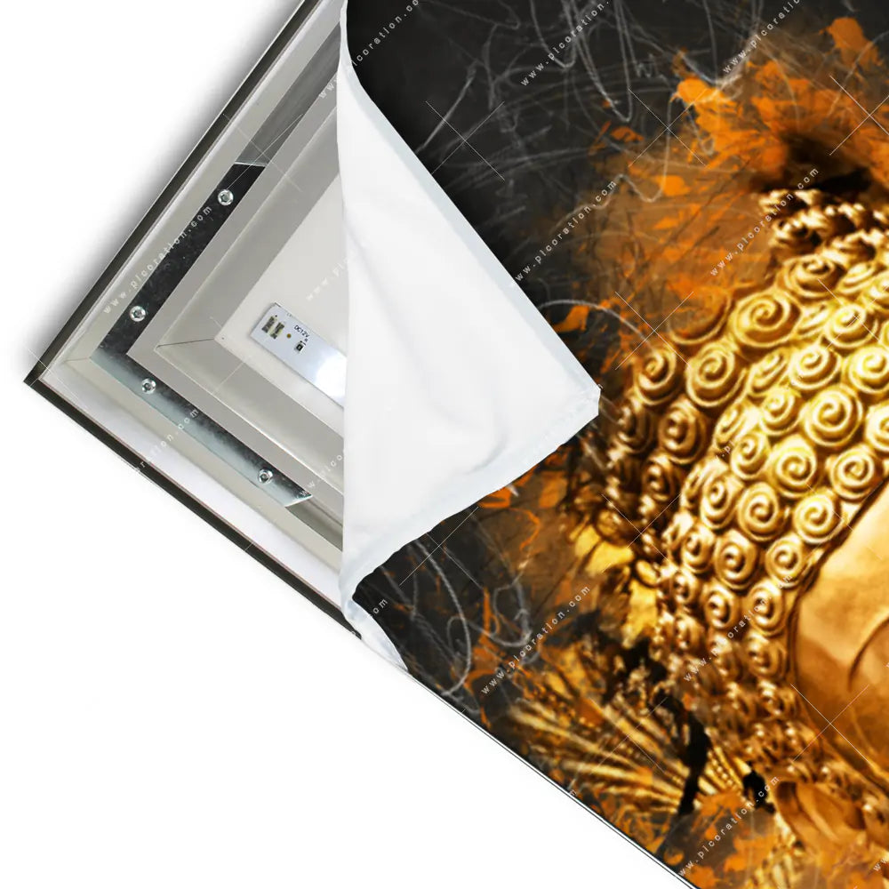 Buddha-Statue mit mystischem Aura-Effekt als Wandbild mit LED-Beleuchtung – einfach beeindruckend