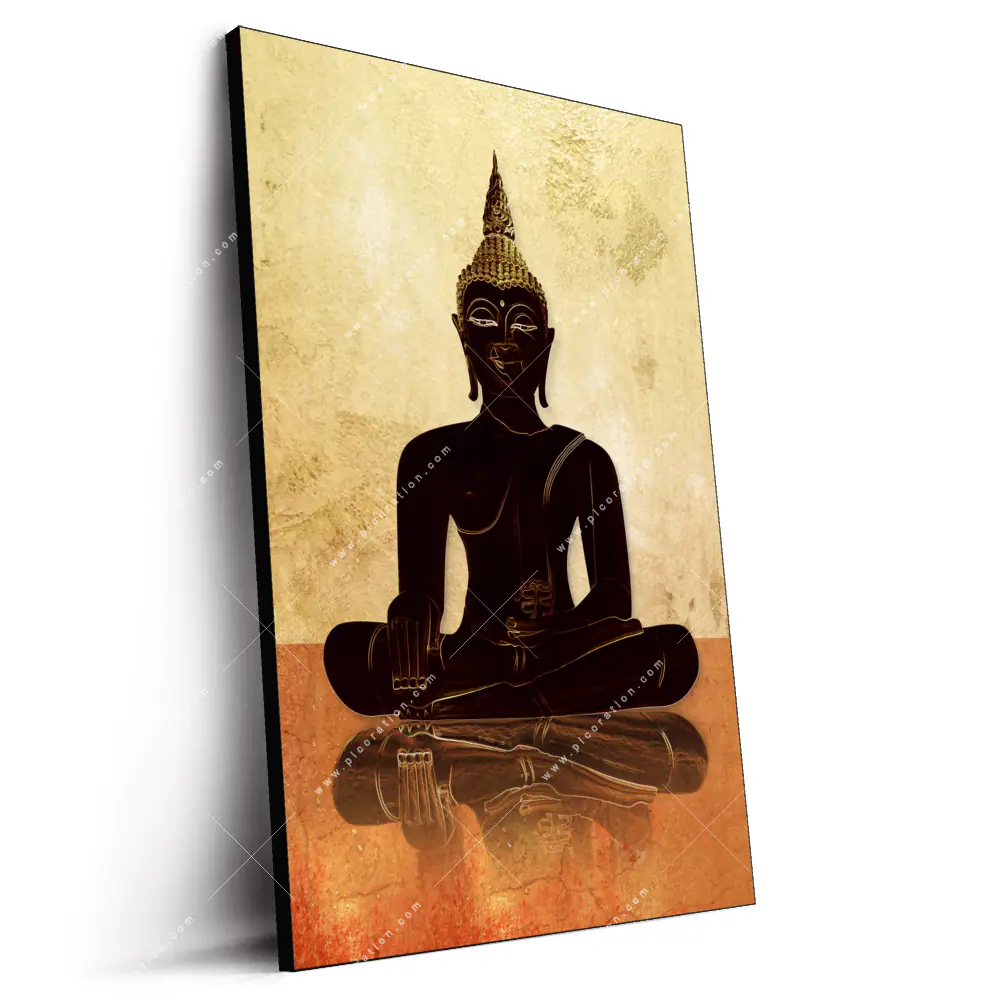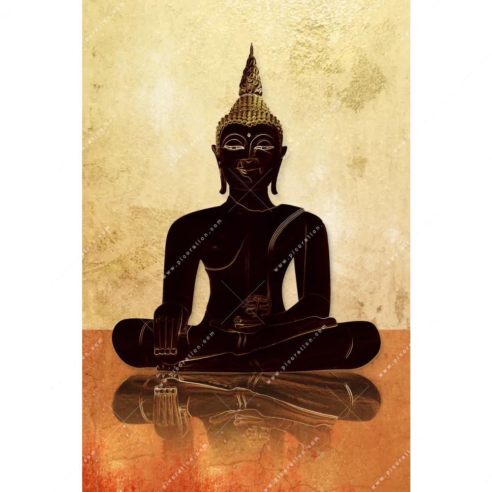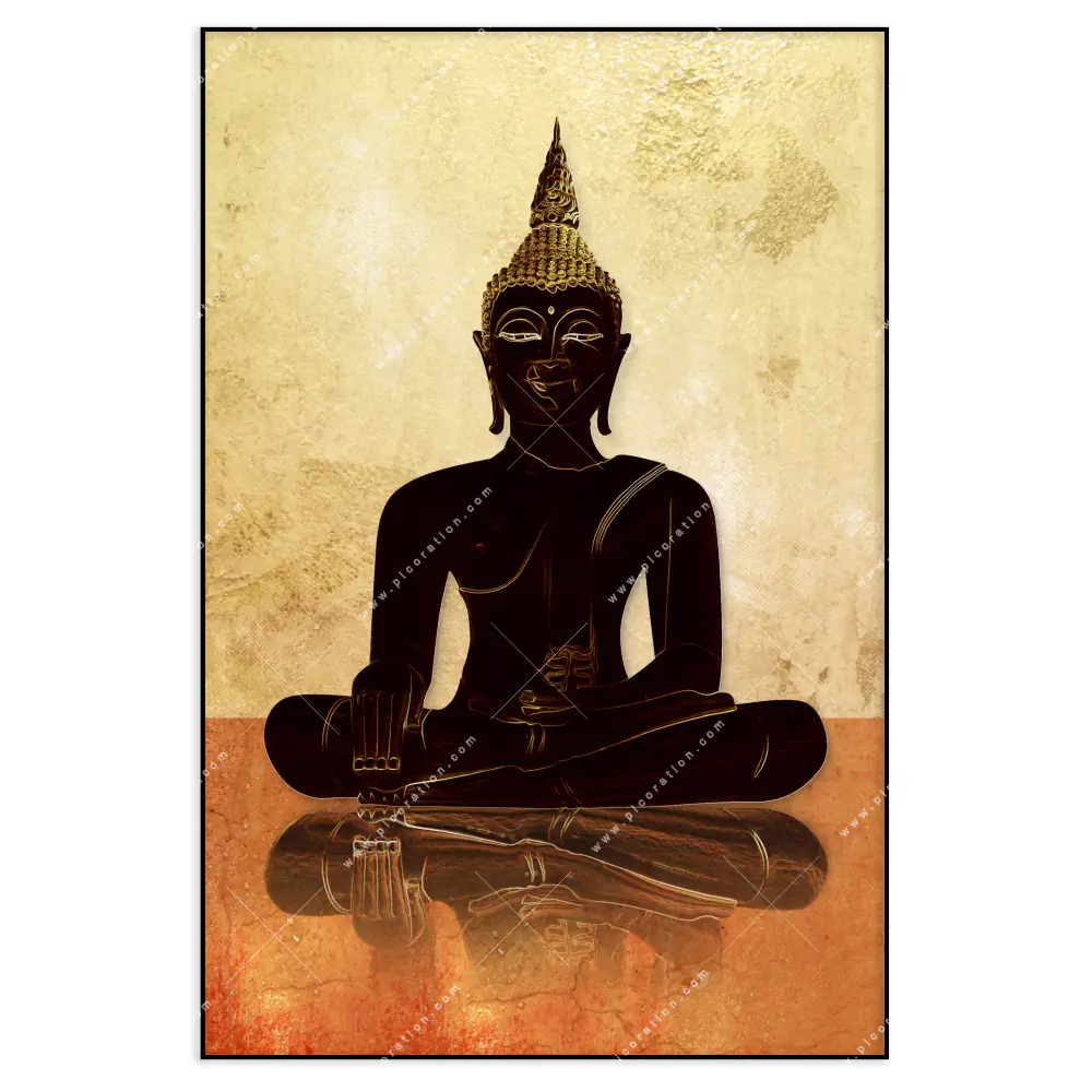 Kontraste der Ruhe: Schwarzer Buddha auf goldenem Grund als LED-Wandbild verleiht dem Raumen einen faszinierenden Zauber