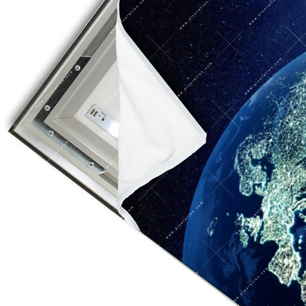 Das textile Oberflächenmaterial des LED-Wandbildes mit dem Motiv Weltraum Erde sorgt für eine hervorragende Lichtdurchlässigkeit, was den Effekt der indirekten Wandbild-Beleuchtung maximiert und das Bild zum Leben erweckt. Lassen Sie Ihr Kinderzimmer, Wohnzimmer - Schlafzimmer mit dem LED-Bild Erde im All der Kategorie Landschaften erstrahlen und erschaffen Sie sich durch diese Atmosphäre eine Wohlfühloase. In diesem LED-Wandbild kommen die Farben Schwarz, Blau, Türkis besonders zur Geltung, was den Stil des Wandbildes weiter untermalt.