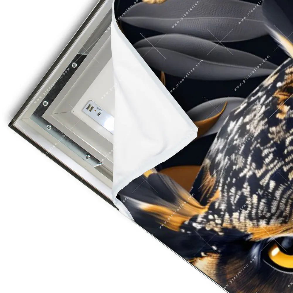Uhu im luxuriösen Blätterwerk als Wandbild mit LED-Beleuchtung – einfach beeindruckend