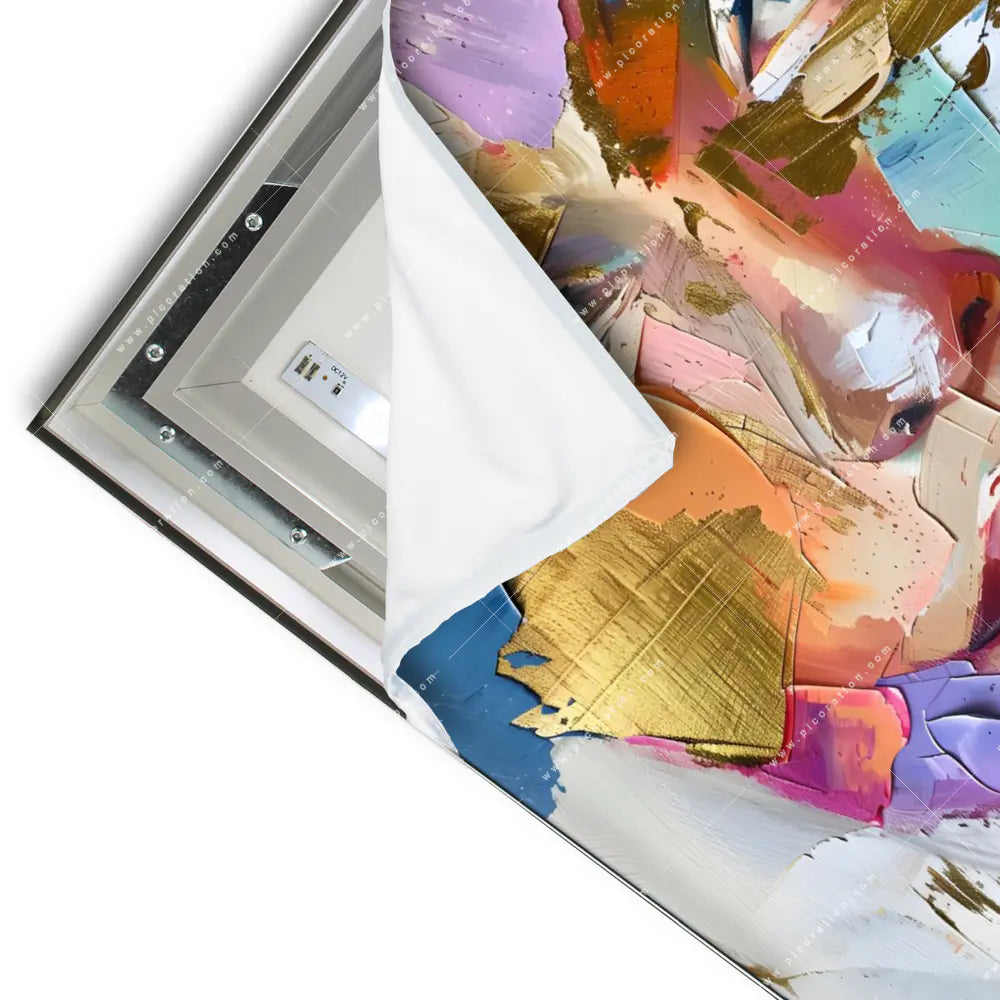 Das innovative LED-Leuchtbild im Quadrat, mit dem Motiv "Farbexplosion - Porträt Nova", ist eine moderne Wanddekoration mit wechselbarem Textildruck. Dieses beleuchtete Wandbild mit dem Thema "Porträts - Menschen" besteht aus einem CANVALIGHT® LED-Spannrahmen von 4,5-6 cm Tiefe. Die integrierte LED-Beleuchtung strahlt in der Lichtfarbe 6500-7000K und erzeugt eine ansprechende Atmosphäre. Der Textildruck zeigt Frauenporträt, Gesicht, Farbexplosion, Farbspritzer, Frau, Porträt und ist auf hochwertigem High-Tech-Polyestergewebe gedruckt. Das Quadrat-Design mit Modernes Porträt mit Gold in den Farben Gold, Blau, Lila wird durch einen umlaufenden Keder im Rahmen gehalten. Unser dimmbares LED Wandbild "Frauenporträt Modern Art" im Modern Art, Abstrakt und modernen Kunststil wird inklusive Fernbedienung geliefert. Das Quadrat LED Bild "LED-Wandbild | Farbexplosion - Porträt Nova | Quadrat" wird steckerfertig produziert und kann direkt an die Steckdose angeschlossen werden. Alternativ kann das Netzteil auch innenliegend (Kabel kommt aus der Wand) verwendet werden.