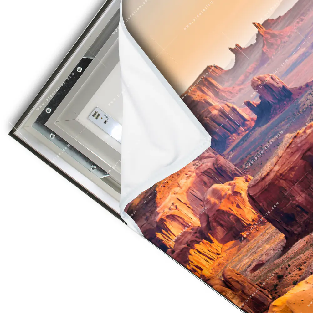 Das innovative LED-Leuchtbild im Querformat, mit dem Motiv "Felsen bei Sonnenuntergang", ist eine moderne Wanddekoration mit wechselbarem Textildruck. Dieses beleuchtete Wandbild mit dem Thema "Landschaften" besteht aus einem CANVALIGHT® LED-Spannrahmen von 4,5-6 cm Tiefe. Die integrierte LED-Beleuchtung strahlt in der Lichtfarbe 6500-7000K und erzeugt eine ansprechende Atmosphäre. Der Textildruck zeigt Sehenswürdigkeit, USA, Landschaft, Sonnenuntergang, Steine und ist auf hochwertigem High-Tech-Polyestergewebe gedruckt. Das Querformat-Design mit Felsen in Wüstenlandschaft in den Farben Orange, Lila, Rot, Rosa, Blau, Grün wird durch einen umlaufenden Keder im Rahmen gehalten. Unser dimmbares LED Wandbild "Felsplateau im Navajo Tribal Park" im Natürlich - Realistisch und modernen Kunststil wird inklusive Fernbedienung geliefert. Das Querformat LED Bild "LED-Wandbild | Felsen bei Sonnenuntergang | Querformat" wird steckerfertig produziert und kann direkt an die Steckdose angeschlossen werden. Alternativ kann das Netzteil auch innenliegend (Kabel kommt aus der Wand) verwendet werden.