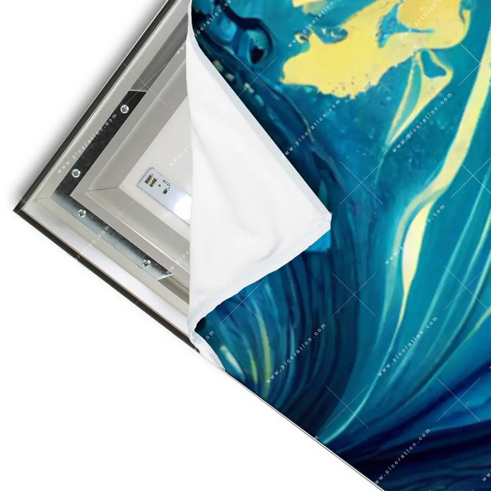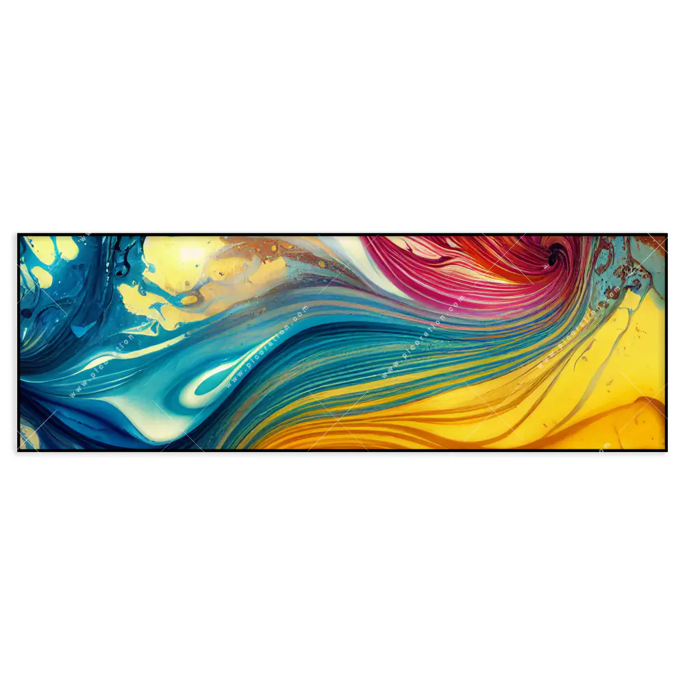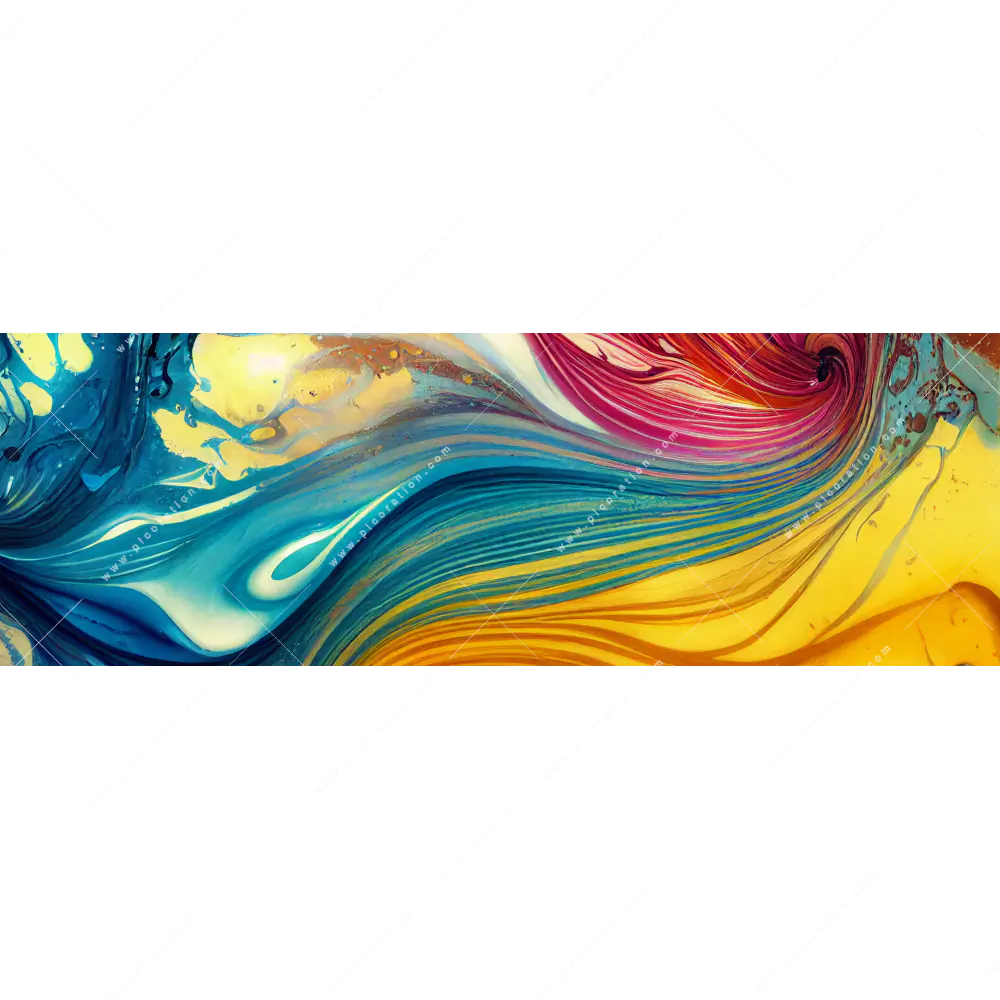 Die dimmbaren LEDs erweitern die künstlerischen Möglichkeiten und schaffen eine anpassbare Beleuchtung, die das Bild Abstrakte Farbgestaltung in rot, gelb, blau lebendig erscheinen lässt. Flüssigkeit, Acryl, flüssig, Farbe, Marmorierung, Fluid Art – all´ das ist in diesem faszinierenden Panorama-Wandbild mit LED´s vereint und macht Ihren Raum zu einem Ort mit einem ganz einmaligen Wohlfühlerlebnis.