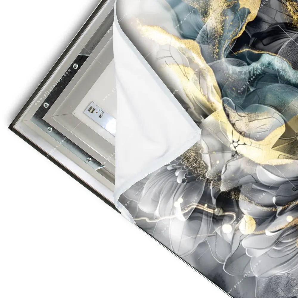 Das innovative LED-Leuchtbild im Hochformat, mit dem Motiv "Fluid Art - Duftende Blüten", ist eine moderne Wanddekoration mit wechselbarem Textildruck. Dieses beleuchtete Wandbild mit dem Thema "Blumen - Botanik, Muster - Texturen" besteht aus einem CANVALIGHT® LED-Spannrahmen von 4,5-6 cm Tiefe. Die integrierte LED-Beleuchtung strahlt in der Lichtfarbe 6500-7000K und erzeugt eine ansprechende Atmosphäre. Der Textildruck zeigt Blumen, Pflanze, Natur, Blüten, Glitzer, Farbspritzer, Fluid Art und ist auf hochwertigem High-Tech-Polyestergewebe gedruckt. Das Hochformat-Design mit Florales abstraktes Design in den Farben Schwarz, Grau , Gold, Türkis wird durch einen umlaufenden Keder im Rahmen gehalten. Unser dimmbares LED Wandbild "Blütenzauber mit Gold" im Abstrakt, Floral, Modern Art und modernen Kunststil wird inklusive Fernbedienung geliefert. Das Hochformat LED Bild "LED-Wandbild | Fluid Art - Duftende Blüten | Hochformat" wird steckerfertig produziert und kann direkt an die Steckdose angeschlossen werden. Alternativ kann das Netzteil auch innenliegend (Kabel kommt aus der Wand) verwendet werden.