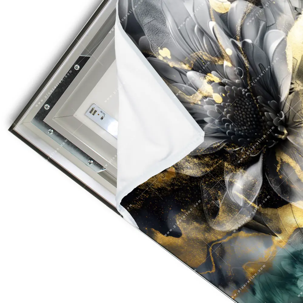 Der Eyecatcher im Raum - Magische Blüten im dunklen Glanz als LED-Wandbild im Hochformat