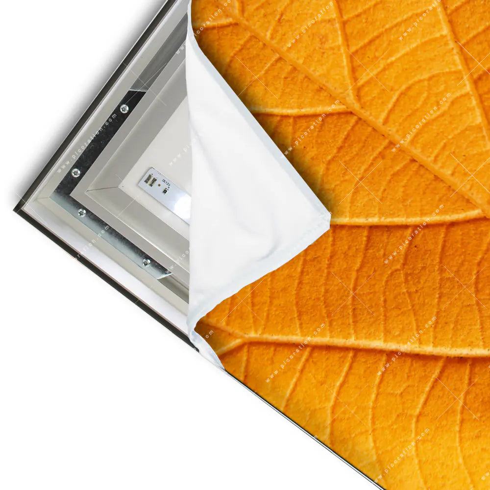 Das LED Wandbild mit dem Motiv Goldenes Blatt der Kategorie Muster - Texturen, Blumen - Botanik ist ein besonders beeindruckendes Wandbild mit LED-Beleuchtung, denn Laubblatt in gold wirkt durch die feinen LED´s hinter der textilen Oberfläche des Wandbildes noch intensiver und faszinierender auf den Betrachter. Unterstützt wird diese Wirkung des Wandbildes durch das Hochformat, welches in den Größen Maße zur Verfügung steht, um sich optimal an Ihre Wand anzuschmiegen und dem Raum ein neues Flair zu verleihen.