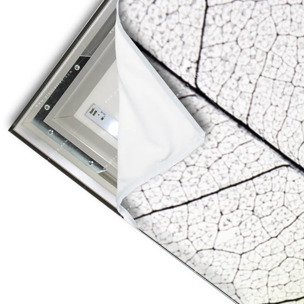 Das textile Oberflächenmaterial des LED-Wandbildes mit dem Motiv Nahaufnahme Laubblatt sorgt für eine hervorragende Lichtdurchlässigkeit, was den Effekt der indirekten Wandbild-Beleuchtung maximiert und das Bild zum Leben erweckt. Lassen Sie Ihr Arzt - Praxis, Büro - Kanzlei, Wohnzimmer - Schlafzimmer mit dem LED-Bild Blatt mit Strukturen der Kategorie Muster - Texturen, Blumen - Botanik erstrahlen und erschaffen Sie sich durch diese Atmosphäre eine Wohlfühloase. In diesem LED-Wandbild kommen die Farben Weiss, Grün besonders zur Geltung, was den Stil des Wandbildes weiter untermalt.