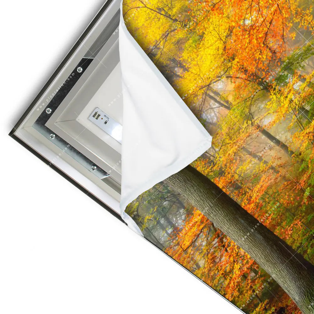 Charme und Flair mit Herbstfarben im nebligen Wald als LED-Wandbild