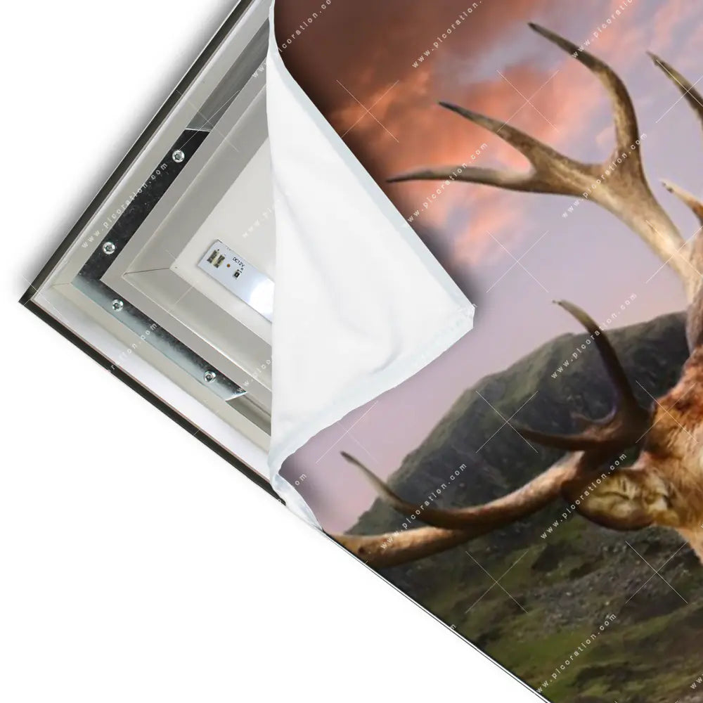 Rothirsch bei Sonnenuntergang als Wandbild mit LED-Beleuchtung – einfach beeindruckend