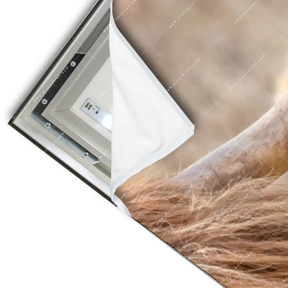 Das textile Oberflächenmaterial des LED-Wandbildes mit dem Motiv Schottisches Rind sorgt für eine hervorragende Lichtdurchlässigkeit, was den Effekt der indirekten Wandbild-Beleuchtung maximiert und das Bild zum Leben erweckt. Lassen Sie Ihr Flur - Eingangsbereich, Wohnzimmer - Schlafzimmer mit dem LED-Bild Porträt eines Hochland-Rindes der Kategorie Tierwelt erstrahlen und erschaffen Sie sich durch diese Atmosphäre eine Wohlfühloase. In diesem LED-Wandbild kommen die Farben Braun, Beige besonders zur Geltung, was den Stil des Wandbildes weiter untermalt.