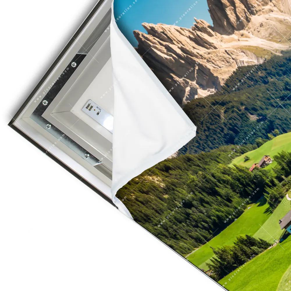 Als Wandbild mit integrierter LED-Beleuchtung wird das Motiv Bergdorf und seine malerische Landschaft von einer besonders faszinierenden Seite dargestellt. Durch die Auswahl an den Größen Maße können Sie das passende Hochformat für Ihre Wand auswählen und so die Einrichtung Ihres Raumes perfektionieren.