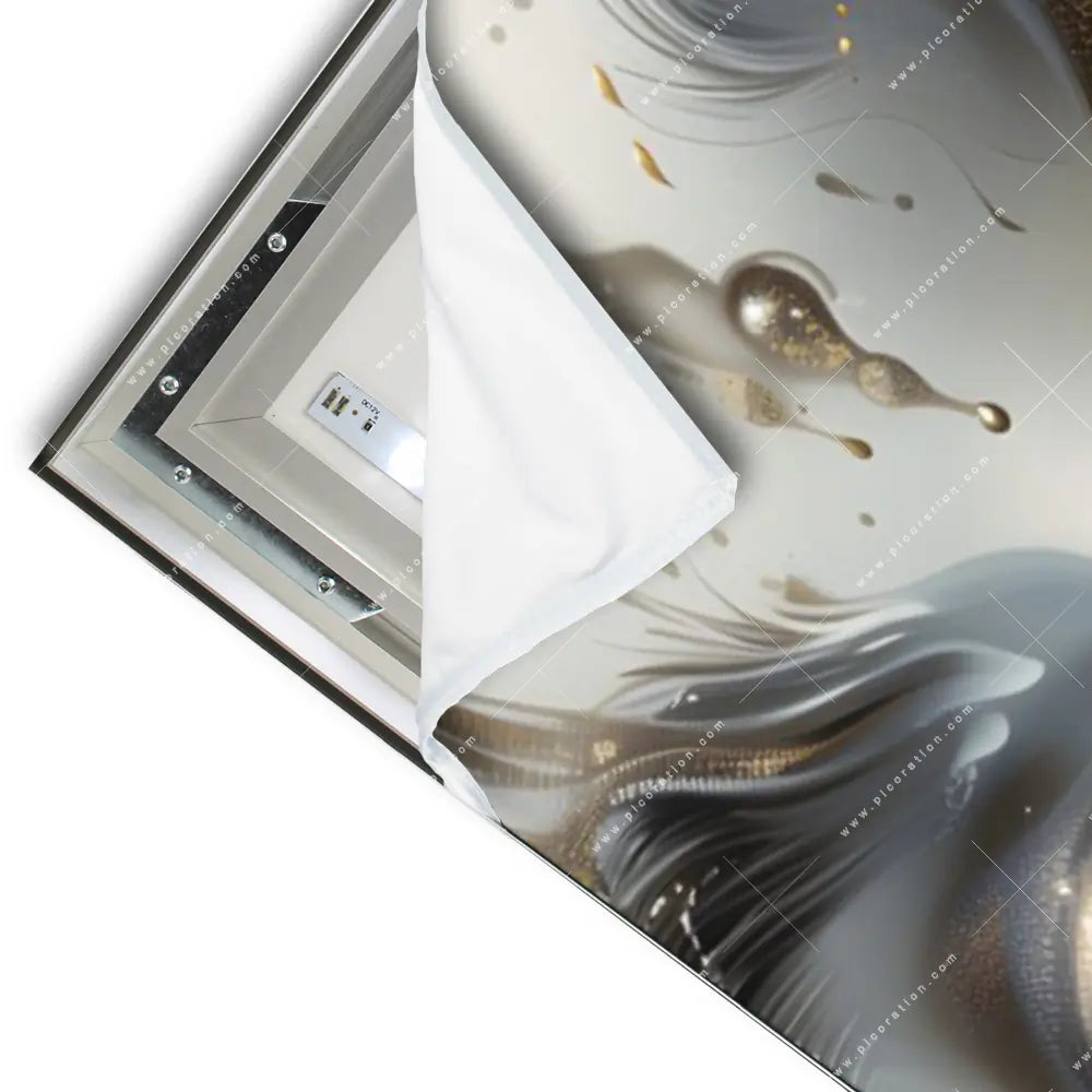 Das textile Oberflächenmaterial des LED-Wandbildes mit dem Motiv Verträumtes Porträt mit Gold sorgt für eine hervorragende Lichtdurchlässigkeit, was den Effekt der indirekten Wandbild-Beleuchtung maximiert und das Bild zum Leben erweckt. Lassen Sie Ihr Friseur - Beauty, Wohnzimmer - Schlafzimmer, Flur - Eingangsbereich mit dem LED-Bild Fluid Art Gesicht der Kategorie Porträts - Menschen erstrahlen und erschaffen Sie sich durch diese Atmosphäre eine Wohlfühloase. In diesem LED-Wandbild kommen die Farben Gold, Grau , Schwarz, Beige besonders zur Geltung, was den Stil des Wandbildes weiter untermalt.