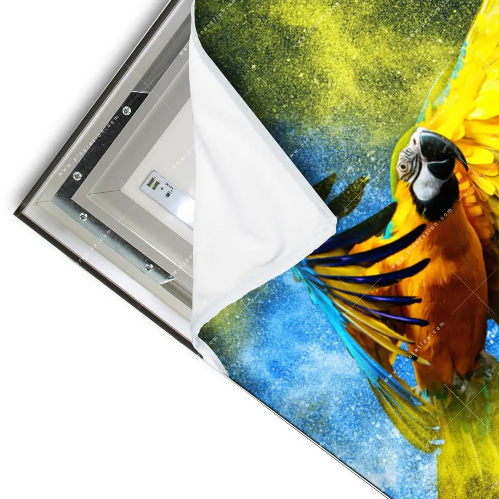 Das LED Wandbild mit dem Motiv Papagei - Farbexplosion der Kategorie Tierwelt ist ein besonders beeindruckendes Wandbild mit LED-Beleuchtung, denn Papagei im Farbpuder wirkt durch die feinen LED´s hinter der textilen Oberfläche des Wandbildes noch intensiver und faszinierender auf den Betrachter. Unterstützt wird diese Wirkung des Wandbildes durch das Hochformat, welches in den Größen Maße zur Verfügung steht, um sich optimal an Ihre Wand anzuschmiegen und dem Raum ein neues Flair zu verleihen.