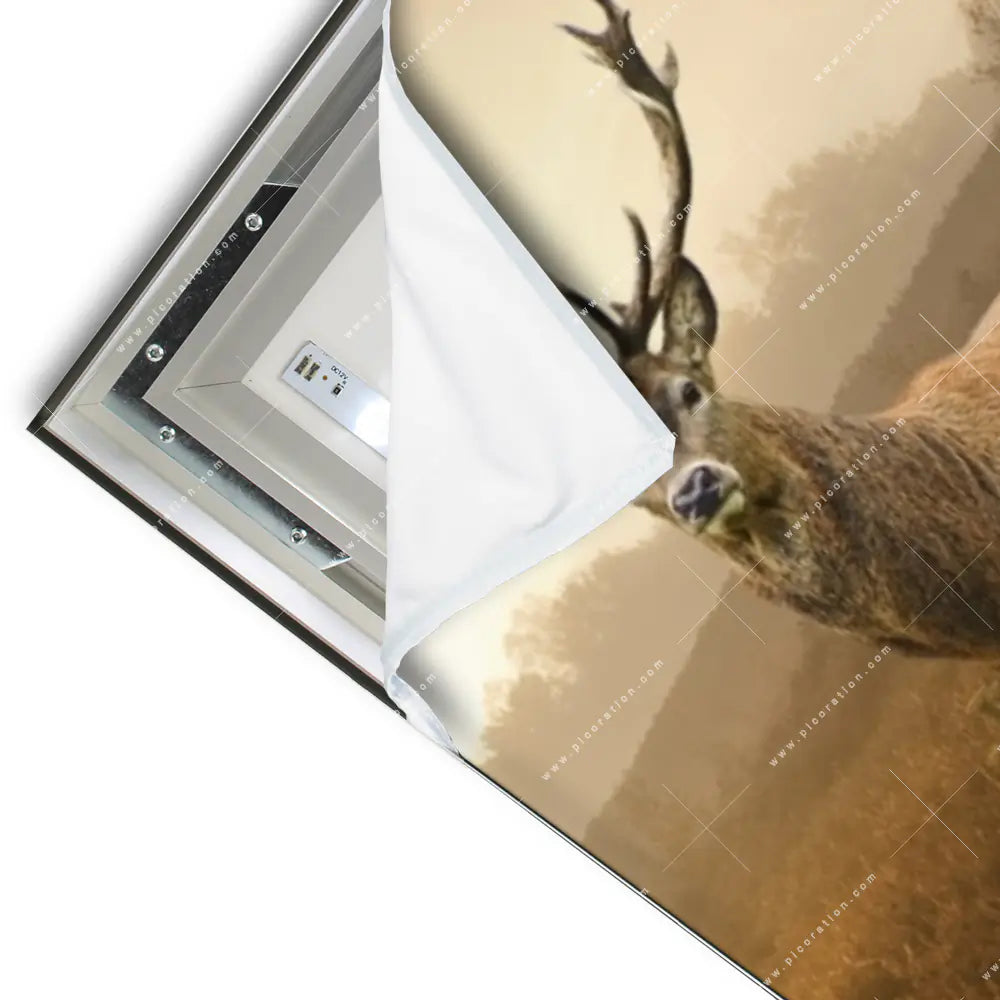 Hirsch im Morgennebel als Wandbild mit LED-Beleuchtung – einfach beeindruckend