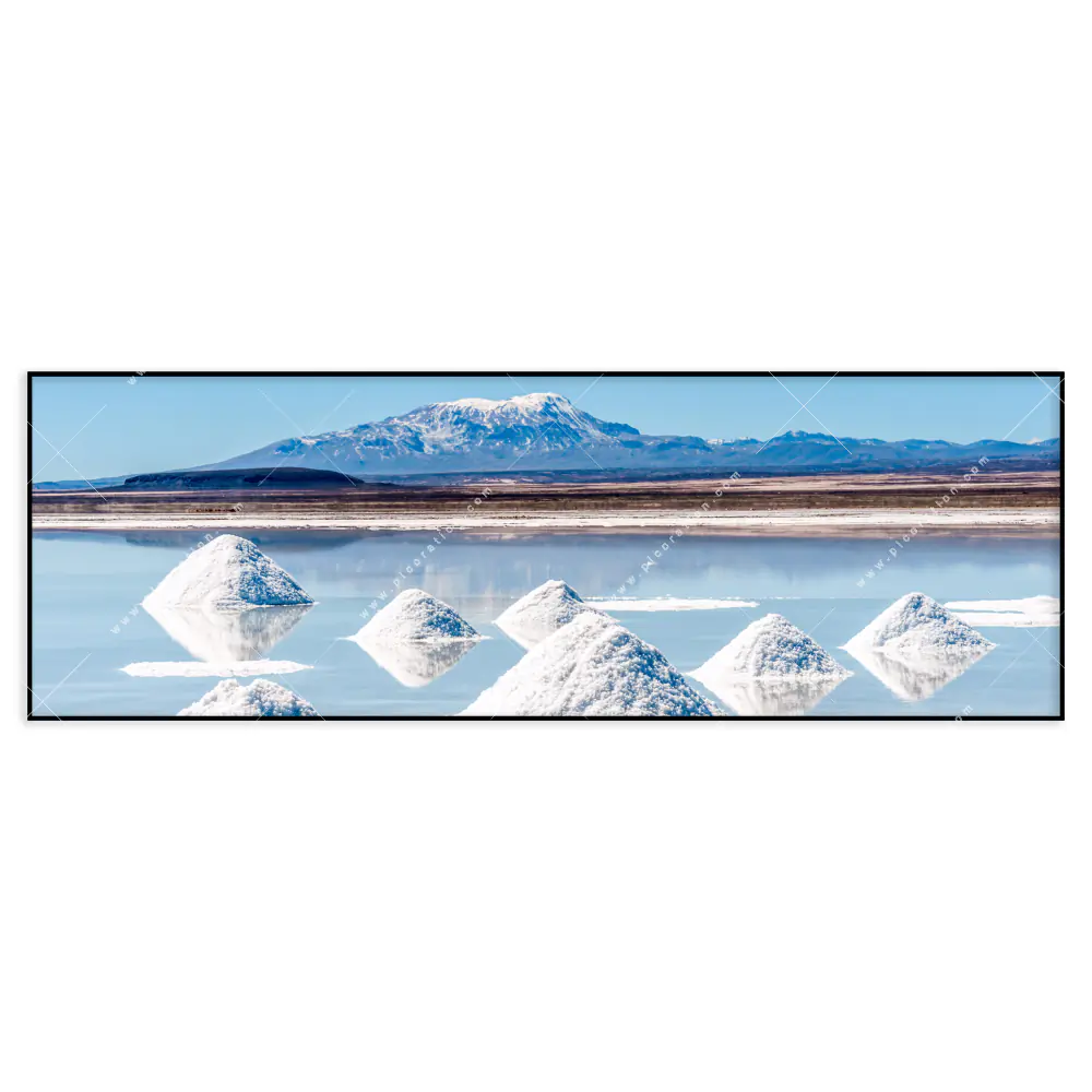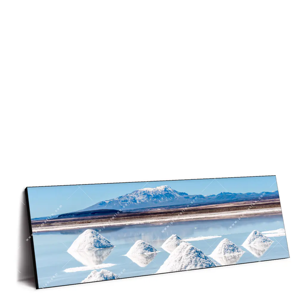 Die dimmbaren LEDs erweitern die künstlerischen Möglichkeiten und schaffen eine anpassbare Beleuchtung, die das Bild Salzernte in Südamerika lebendig erscheinen lässt. Natur, Berge, See, Himmel, Südamerika, Bolivien, Spiegelung, Wasser, Wasserspiegelung – all´ das ist in diesem faszinierenden Panorama-Wandbild mit LED´s vereint und macht Ihren Raum zu einem Ort mit einem ganz einmaligen Wohlfühlerlebnis.