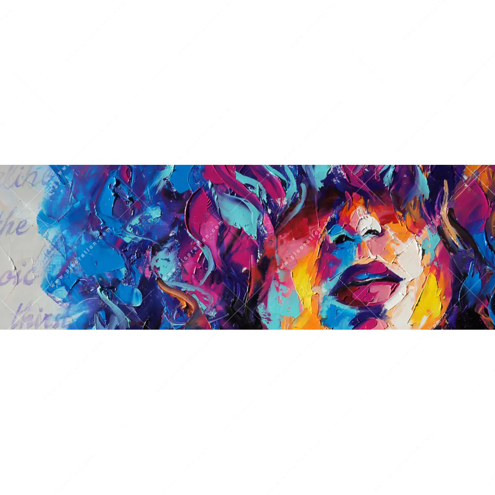 Die dimmbaren LEDs erweitern die künstlerischen Möglichkeiten und schaffen eine anpassbare Beleuchtung, die das Bild buntes Frauenporträt lebendig erscheinen lässt. Abstrakt, Modern, Kunst, Gemälde, Ölfarbe, Leinwand, Frau, Portrait, Geheimnis, Lippen, Schönheit, Gesicht – all´ das ist in diesem faszinierenden Panorama-Wandbild mit LED´s vereint und macht Ihren Raum zu einem Ort mit einem ganz einmaligen Wohlfühlerlebnis.