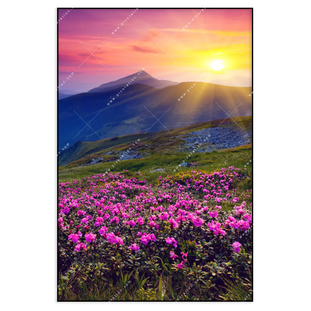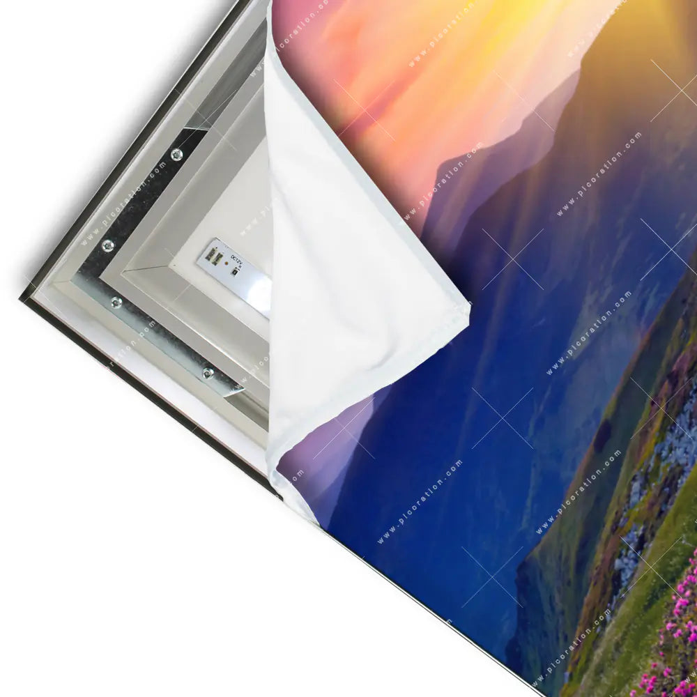 Das LED Wandbild mit dem Motiv Sommerberg im Sonnenuntergang der Kategorie Landschaften ist ein besonders beeindruckendes Wandbild mit LED-Beleuchtung, denn blühende Wiese in den Bergen wirkt durch die feinen LED´s hinter der textilen Oberfläche des Wandbildes noch intensiver und faszinierender auf den Betrachter. Unterstützt wird diese Wirkung des Wandbildes durch das Hochformat, welches in den Größen Maße zur Verfügung steht, um sich optimal an Ihre Wand anzuschmiegen und dem Raum ein neues Flair zu verleihen.