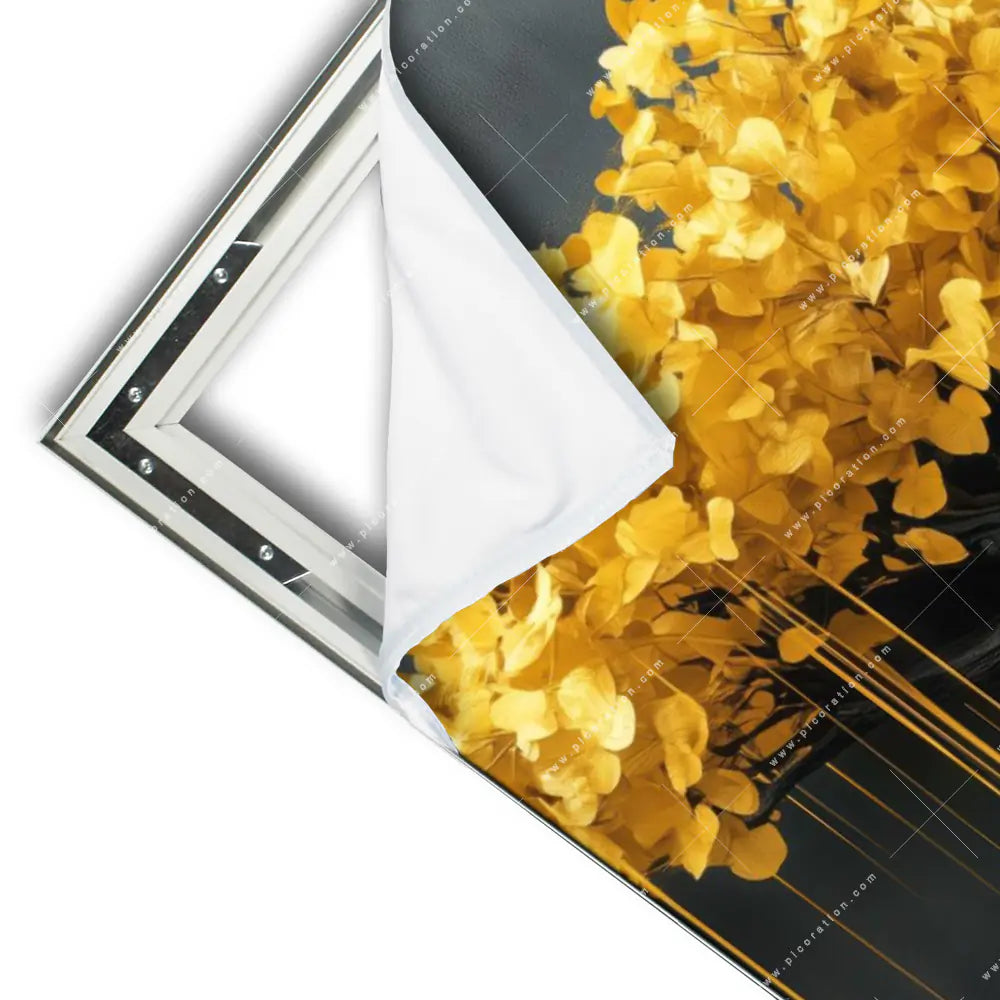 Das XXL Wandbild Der Baum - Stille in Gold der Kategorie Wald - Bäume, Blumen - Botanik im Hochformat ist ein beeindruckender Blickfang in Ihrem Arzt - Praxis, Büro - Kanzlei, Wohnzimmer - Schlafzimmer, Flur - Eingangsbereich. Je nach Größe Maße kann es ein wandfüllendes Kunstwerk werden oder einen Akzent setzen. Gerade in größeren Räumen, wie Wohn-, Empfangs- oder Besprechungsräumen, bietet sich das Hochformat an, um die Architektur zu betonen und den Raum zu füllen. Es lässt den Raum höher und beeindruckend erscheinen und schafft eine angenehme und inspirierende Atmosphäre.