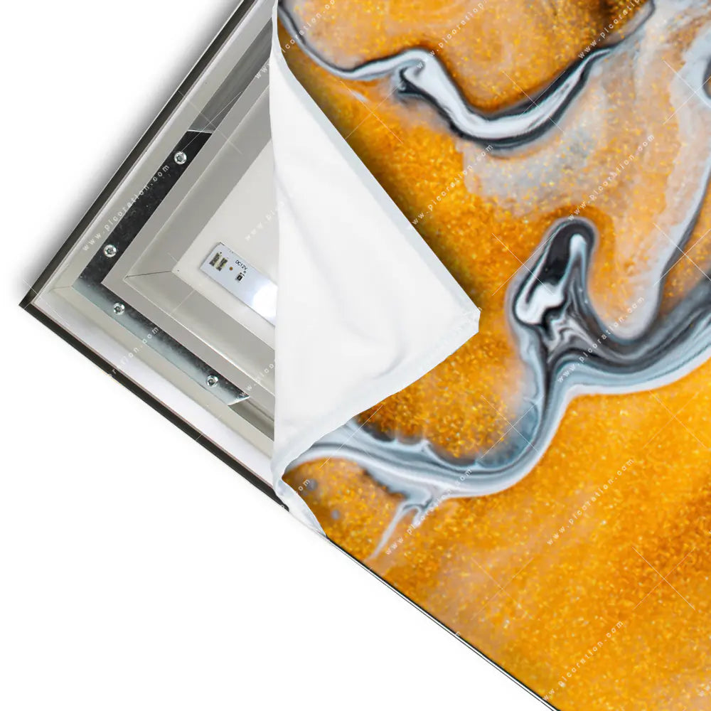 Das innovative LED-Leuchtbild im Schmal, mit dem Motiv "Luxury Abstract Fluid Art No. 4", ist eine moderne Wanddekoration mit wechselbarem Textildruck. Dieses beleuchtete Wandbild mit dem Thema "Muster - Texturen" besteht aus einem CANVALIGHT® LED-Spannrahmen von 4,5-6 cm Tiefe. Die integrierte LED-Beleuchtung strahlt in der Lichtfarbe 6500-7000K und erzeugt eine ansprechende Atmosphäre. Der Textildruck zeigt Flüssigkeit, Acryl, flüssig, Farbe, Marmorierung, Fluid Art und ist auf hochwertigem High-Tech-Polyestergewebe gedruckt. Das Schmal-Design mit Farbfluss metallische Farben in den Farben Schwarz, Orange, Gold, Weiss wird durch einen umlaufenden Keder im Rahmen gehalten. Unser dimmbares LED Wandbild "edle Marmorierung" im Abstrakt, Modern Art und modernen Kunststil wird inklusive Fernbedienung geliefert. Das Schmal LED Bild "LED-Wandbild | Luxury Abstract Fluid Art No. 4 | Schmal" wird steckerfertig produziert und kann direkt an die Steckdose angeschlossen werden. Alternativ kann das Netzteil auch innenliegend (Kabel kommt aus der Wand) verwendet werden.