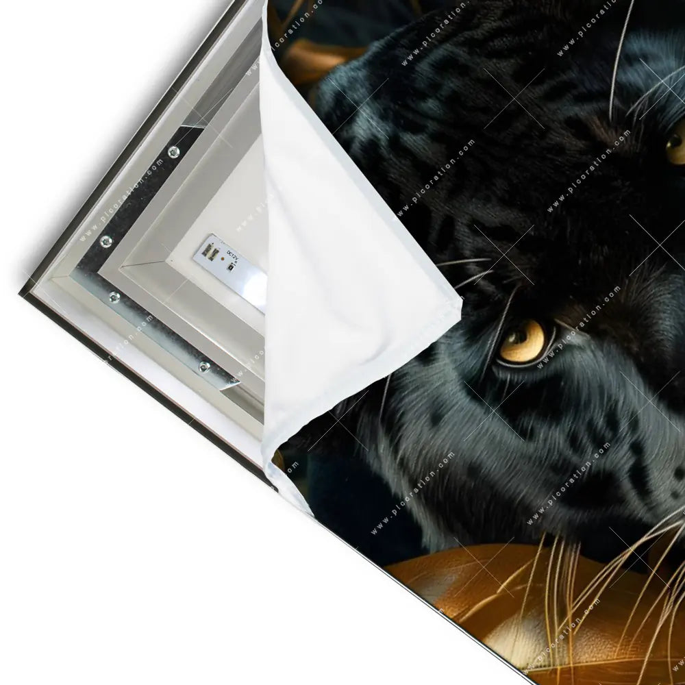 Raubkatze zwischen goldenen Blättern als LED-Wandbild verleiht dem Raumen einen faszinierenden Zauber