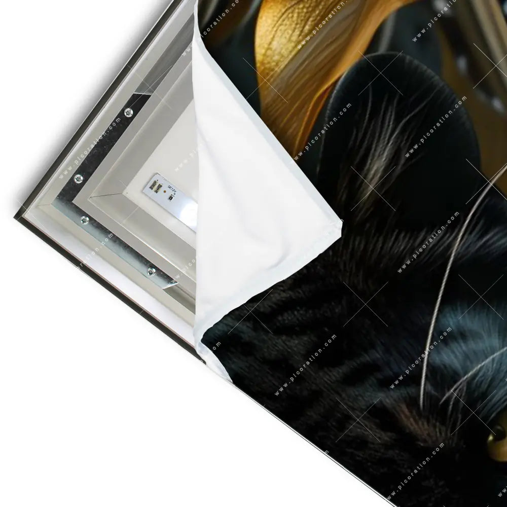 Das textile Oberflächenmaterial des LED-Wandbildes mit dem Motiv Raubkatze zwischen goldenen Blättern sorgt für eine hervorragende Lichtdurchlässigkeit, was den Effekt der indirekten Wandbild-Beleuchtung maximiert und das Bild zum Leben erweckt. Lassen Sie Ihr Arzt - Praxis, Büro - Kanzlei, Wohnzimmer - Schlafzimmer, Flur - Eingangsbereich mit dem LED-Bild Mystische Dschungelszene mit Panther der Kategorie Blumen - Botanik, Tierwelt erstrahlen und erschaffen Sie sich durch diese Atmosphäre eine Wohlfühloase. In diesem LED-Wandbild kommen die Farben Schwarz, Gold besonders zur Geltung, was den Stil des Wandbildes weiter untermalt.