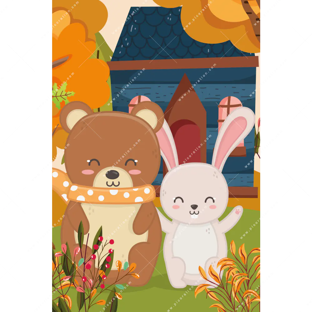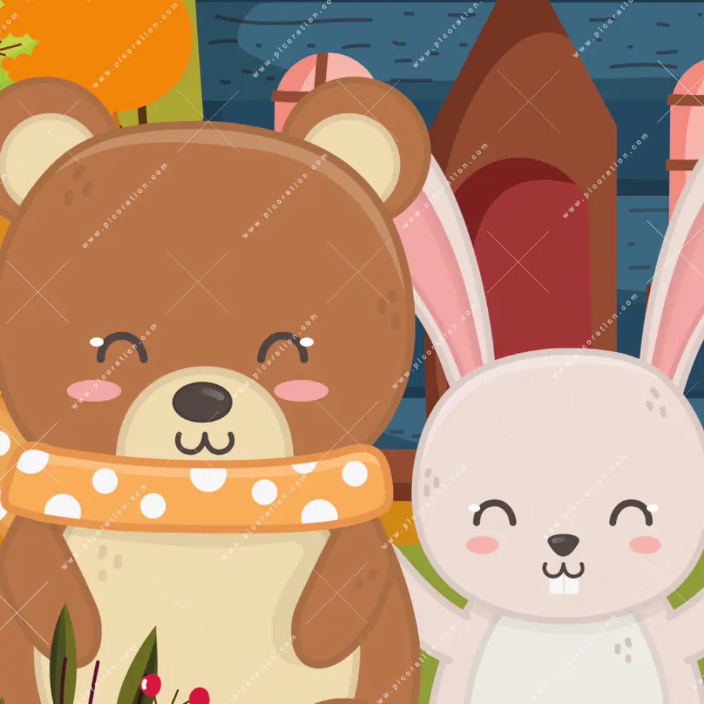 Kaninchen und Bär im Wald als Textil-Ersatzdruck