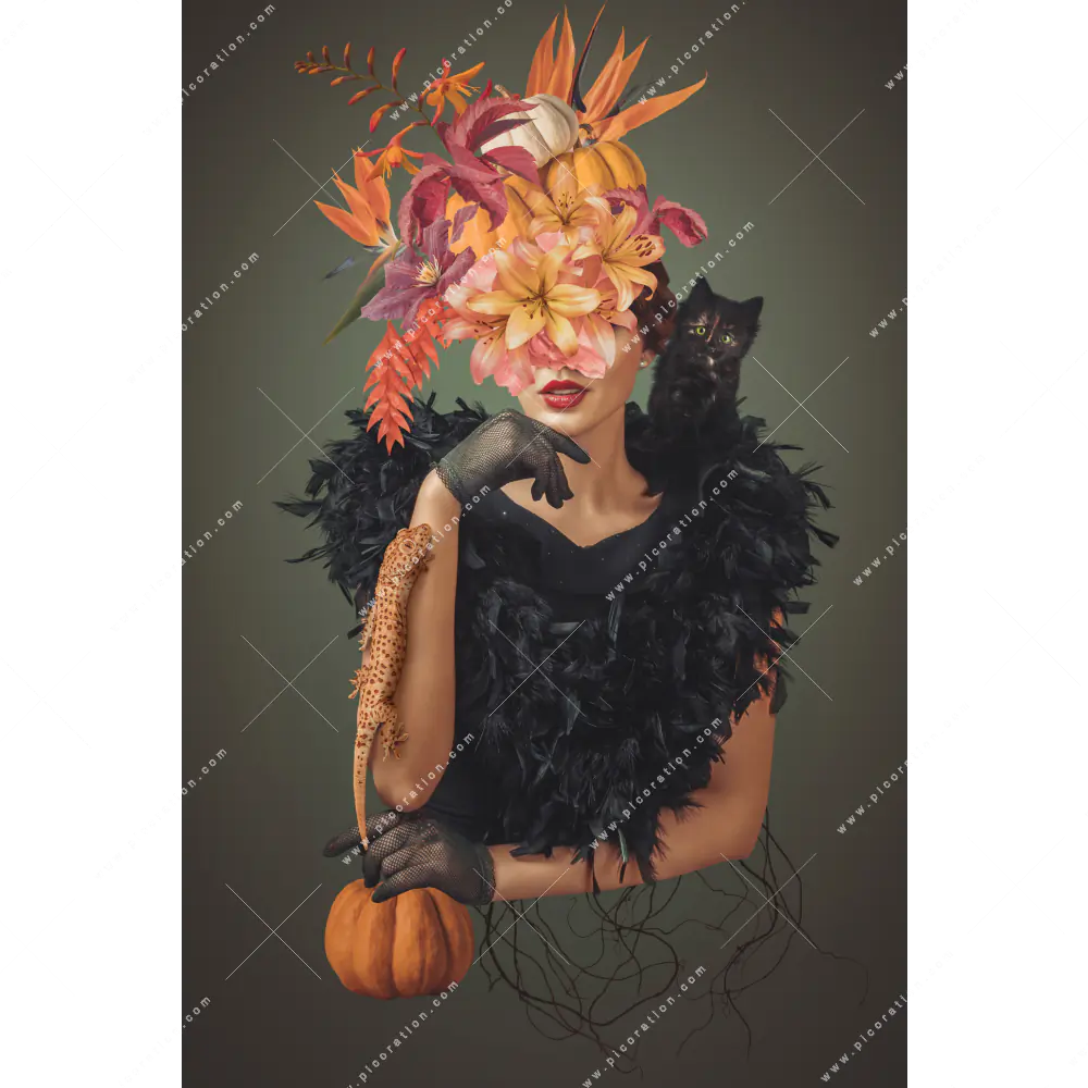 - Schlagwörter: Menschen & Blumen, Frau, Porträt, modern, Beauty, Gesicht, Blumen, Blüten, Schönheit, Mode, Halloween, Katze, Echse, Kürbis