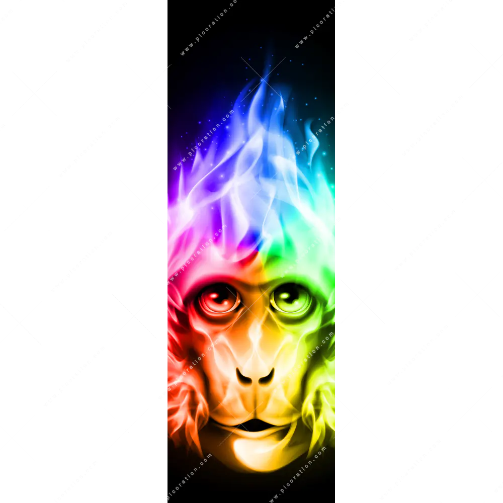 Bunter Feuer-Affe im Panorama-Hochformat verleiht Ihrem Raum eine gemütliche und gleichzeitig beeindruckende Atmosphäre, die Sie nicht mehr missen wollen. Die Farbgebung Schwarz, Bunt sowie der Pop Art, Modern Art, Abstrakt Stil der Vektor - Illustration sorgen für ein harmonisches, atemberaubendes Bild an Ihrer Wand. Und das Ganze ist mit wenigen Handgriffen umgesetzt – tauschen Sie mit unserem Textilersatzdruck einfach und schnell Ihr Wandbild-Motiv und erleben Sie den neuen Charme Ihres Raumes. Tier, Affe, Monkey, Feuer, Fire, Flammen – alles ist in Ihrem neuen Motiv vereint.