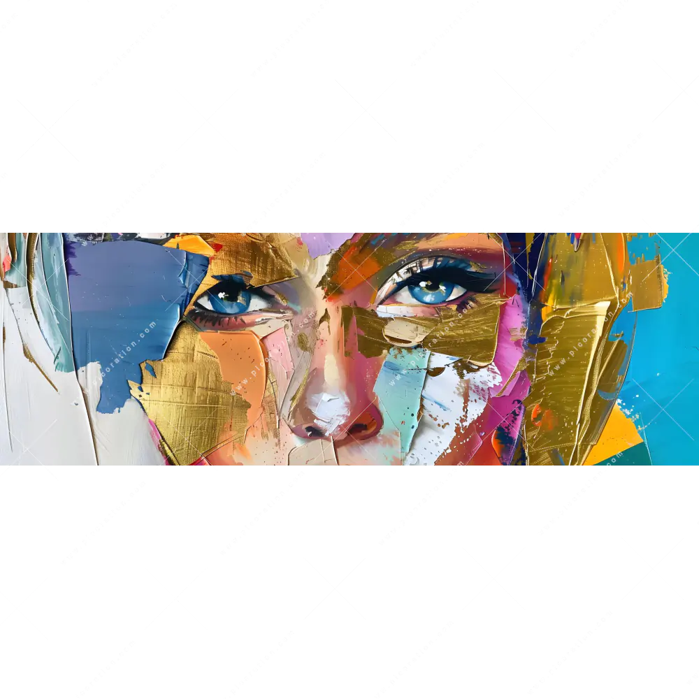 Bringen Sie Farbe und Tiefe in Ihre Welt mit unserem Textilersatzdruck Modernes Porträt mit Gold für Ihr Wandbild im Panoramaformat. Dank seiner überragenden Langlebigkeit, dem strapazierfähigen Stoffmaterial und der großen Auswahl an Größen können Sie sich darauf verlassen, dass es ein stilvolles Update ist, das den Test der Zeit bestehen wird! Insbesondere das Motiv Buntes Gesicht einer Frau der Kategorie Porträts - Menschen erstrahlt in den Farben Gold, Blau, Lila, wodurch der Modern Art, Abstrakt Stil der Kunst - Malerei noch mehr zur Geltung kommt und eine ganz besondere, atemberaubende Atmosphäre in Ihrem Raum entsteht.