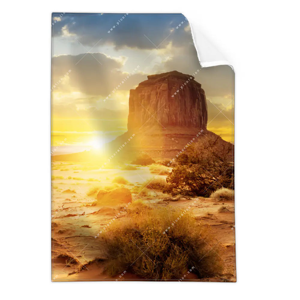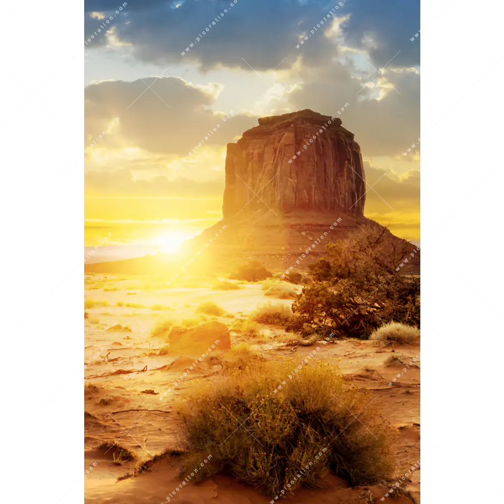 Unser atemberaubendes Motiv Felsen in Wüste im Hochformat passt sich perfekt an Ihren Stil an und lässt Ihre Räume in neuem Glanz und Licht erstrahlen. Mit diesem Textil-Ersatzdruck Monument Valley Felsen in der Abendsonne für Ihr hochformatiges Wandbild können Sie Ihre Arzt - Praxis, Bar - Gastronomie, Büro - Kanzlei, Flur - Eingangsbereich, Wohnzimmer - Schlafzimmer größer, höher und geräumiger wirken lassen, was sich vor allem bei kleinen Räumen anbietet. Nicht nur räumliche Größe verschaffen Sie sich mit diesem einfachen Motivwechsel bei Ihrem Wandbild, sondern auch großen Charakter und Widererkennungswert. Unser Ersatzmotiv Felsen in Wüstenlandschaft bei Sonnenuntergang im Hochformat lässt auch keine Gemütlichkeit und Gelassenheit weichen, im Gegenteil - unsere neuen Wandbild-Motive schaffen noch mehr Wohlfühlcharakter.