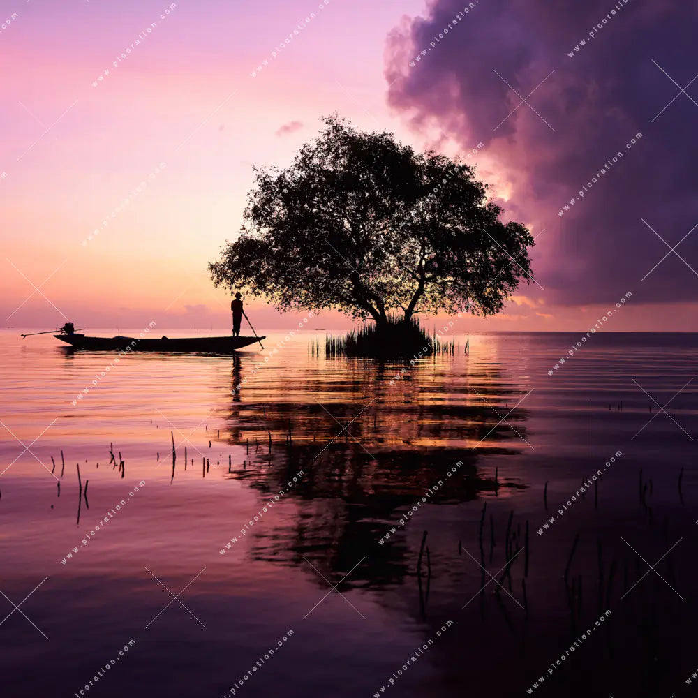 Unser quadratisches Motiv Fischer auf Boot Sonnenaufgang jetzt in Ihrem Wohnzimmer - Schlafzimmer, Flur - Eingangsbereich, Büro - Kanzlei, Arzt - Praxis
