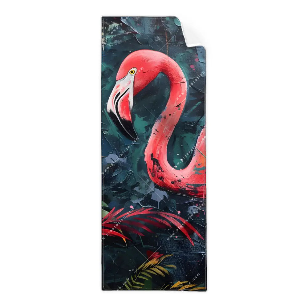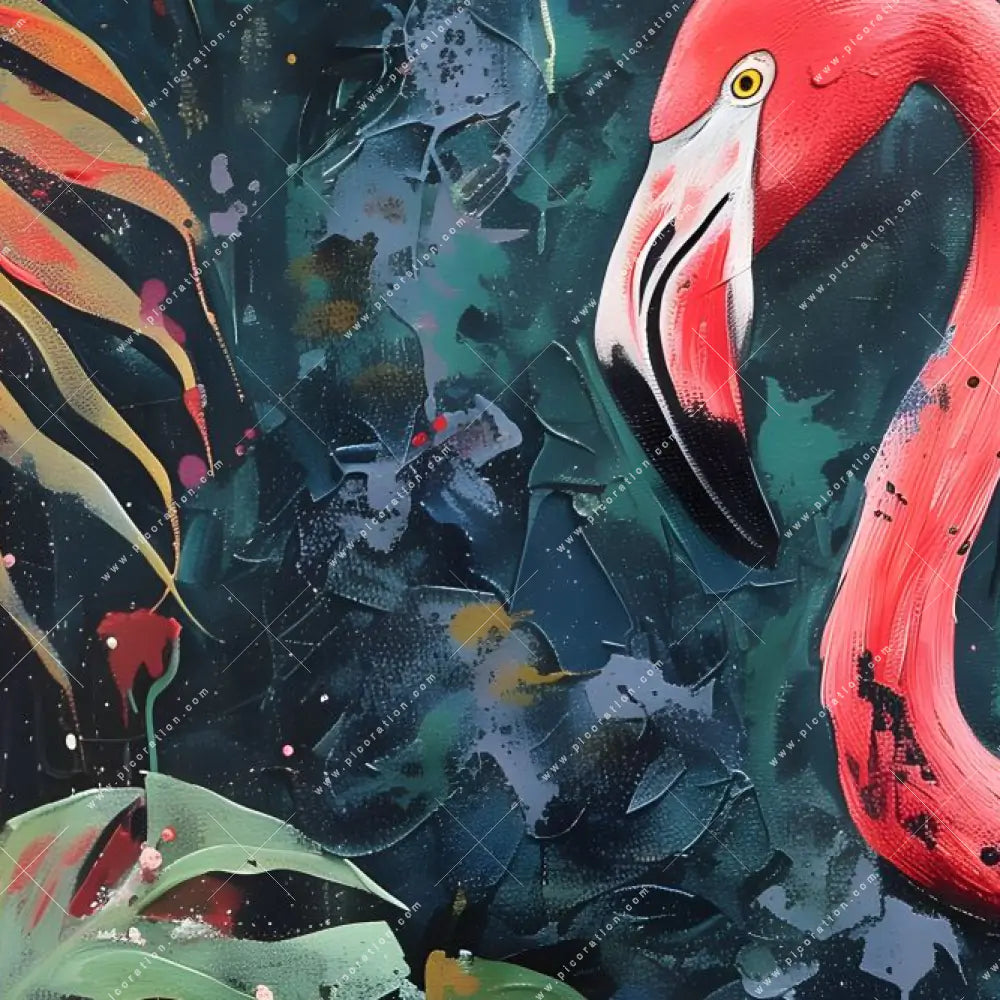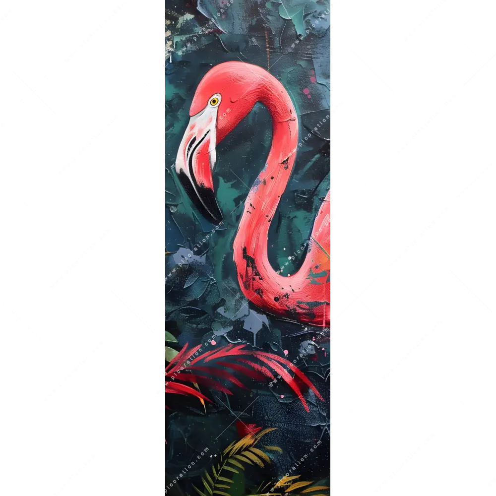 Flamingo - Dschungel Eleganz im Panorama-Hochformat verleiht Ihrem Raum eine gemütliche und gleichzeitig beeindruckende Atmosphäre, die Sie nicht mehr missen wollen. Die Farbgebung Pink, Schwarz, Rosa, Grün sowie der Abstrakt, Modern Art, Floral Stil der Kunst - Malerei, Digitale Kunst sorgen für ein harmonisches, atemberaubendes Bild an Ihrer Wand. Und das Ganze ist mit wenigen Handgriffen umgesetzt – tauschen Sie mit unserem Textilersatzdruck einfach und schnell Ihr Wandbild-Motiv und erleben Sie den neuen Charme Ihres Raumes. Flamingo, Vogel, Tierporträt, Dschungel, Farbe, Blätter, Pflanzen, Regenwald – alles ist in Ihrem neuen Motiv vereint.