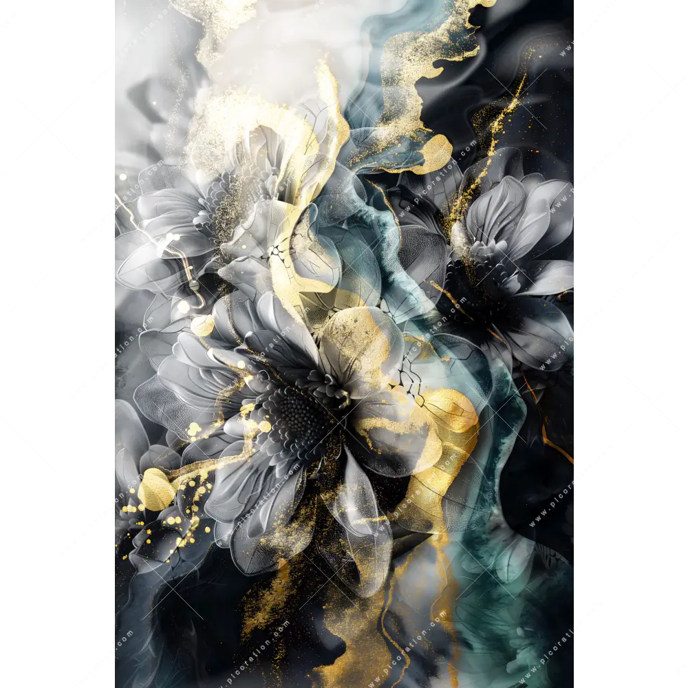 Das Wechselmotiv für Ihr Wandbild mit dem Motiv Blütenzauber mit Gold der Kategorie Blumen - Botanik, Muster - Texturen ist eine ausgezeichnete Wahl, um eine harmonische Wohlfühlatmosphäre zu schaffen. Das Maße große Spannbild als Textil-Ersatzdruck passt perfekt in Ihr Wohnzimmer - Schlafzimmer, Arzt - Praxis, Flur - Eingangsbereich. Sowohl die Schwarz, Grau , Gold, Türkis Farbe als auch der Abstrakt, Floral, Modern Art Stil der Digitale Kunst, Kunst - Malerei sind aufeinander abgestimmt, sodass das Wandbild mit Ihren Möbeln und Ihrer Innenausstattung im Einklang ist. Blumen, Pflanze, Natur, Blüten, Glitzer, Farbspritzer, Fluid Art – alles in Ihrem neuen Motiv vereint - lässt Erholung und Entspannung wieder frisch aufleben und setzt Ihrem Raum auch dieses Mal ein einzigartiges Highlight. Bringen Sie in Sekunden Frische in Ihre Räume und erleben Sie neue aufregende Welten mit einem Textil-Ersatzdruck für Ihr Spannbild im Hochformat.