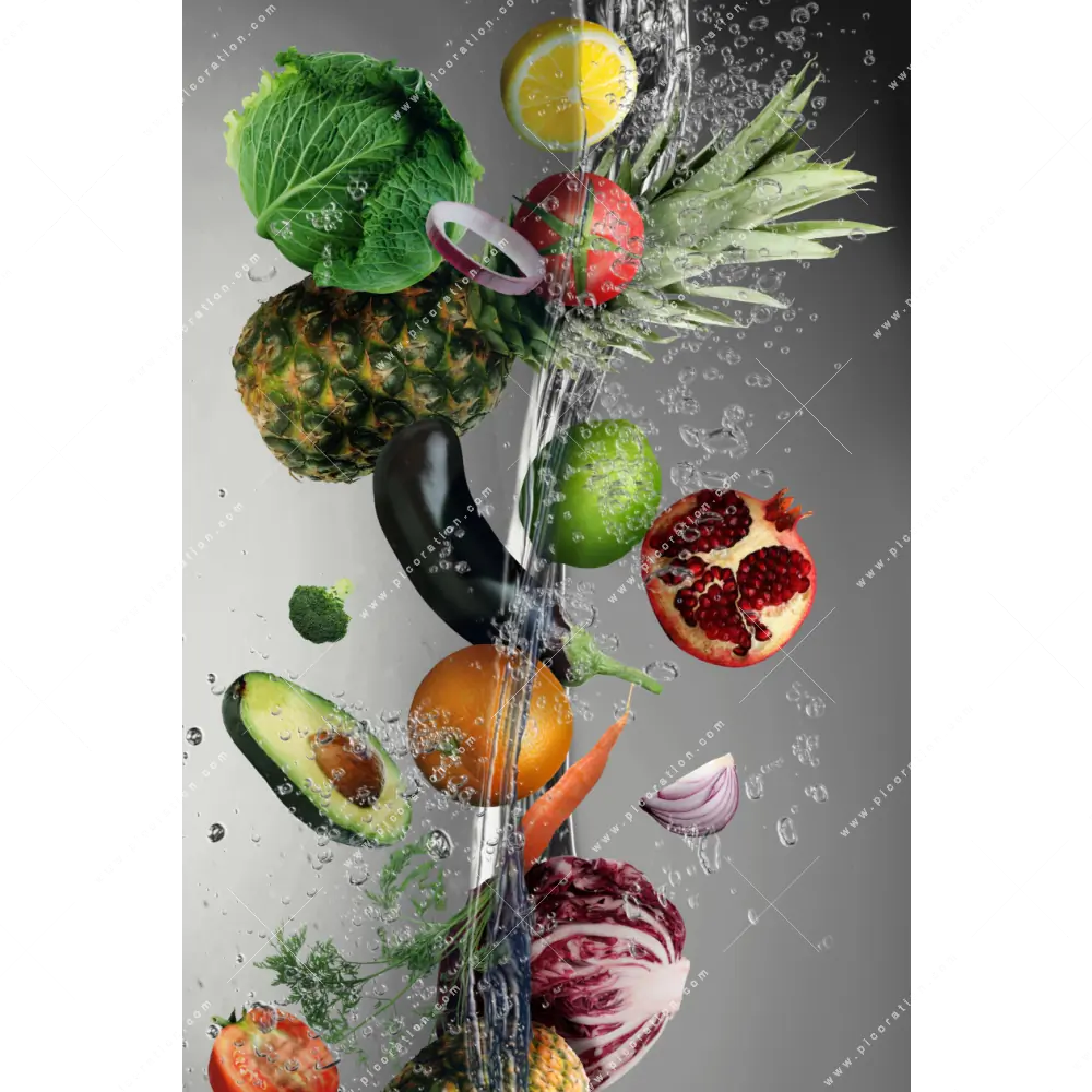 Das Wechselmotiv für Ihr Wandbild mit dem Motiv Buntes Gemüse in Spritzwasser der Kategorie Essen - Trinken ist eine ausgezeichnete Wahl, um eine harmonische Wohlfühlatmosphäre zu schaffen. Das Maße große Spannbild als Textil-Ersatzdruck passt perfekt in Ihr Bar - Gastronomie, Küche - Esszimmer. Sowohl die Grau , Grün, Rot, Gelb , Orange Farbe als auch der Mixed Media, Modern Art Stil der Fotografie, Digitale Kunst sind aufeinander abgestimmt, sodass das Wandbild mit Ihren Möbeln und Ihrer Innenausstattung im Einklang ist. Obst, Zitrusfrüchte, Früchte, Banane, Ananas, Spritzwasser, Wasser, Spritzer, Tropfen, Wassertropfen, Ernährung, Gesundheit, Lebensmittel – alles in Ihrem neuen Motiv vereint - lässt Erholung und Entspannung wieder frisch aufleben und setzt Ihrem Raum auch dieses Mal ein einzigartiges Highlight. Bringen Sie in Sekunden Frische in Ihre Räume und erleben Sie neue aufregende Welten mit einem Textil-Ersatzdruck für Ihr Spannbild im Hochformat.