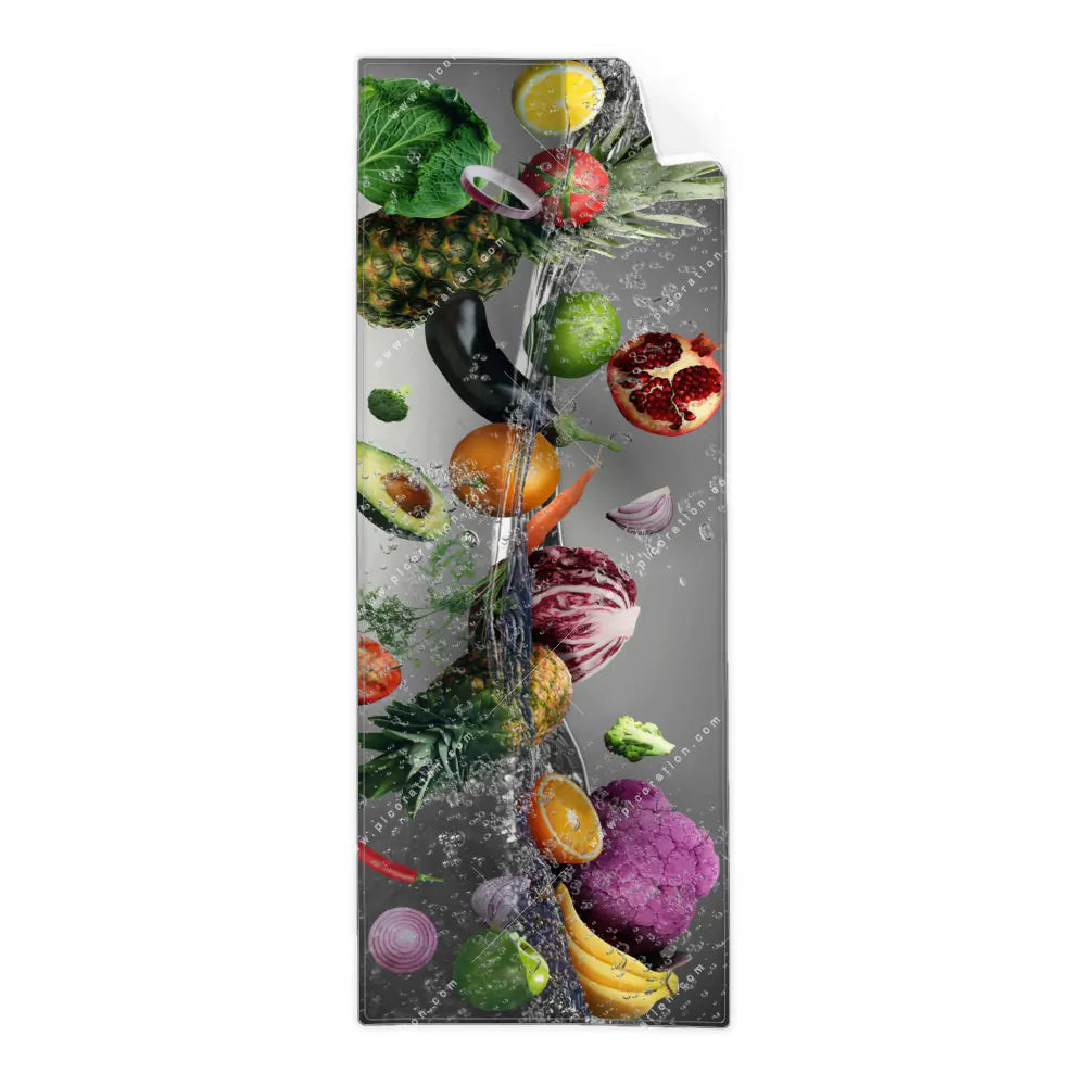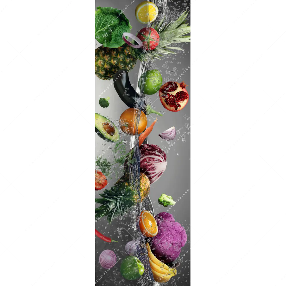 Frische Gemüse-Explosion im Panorama-Hochformat verleiht Ihrem Raum eine gemütliche und gleichzeitig beeindruckende Atmosphäre, die Sie nicht mehr missen wollen. Die Farbgebung Grau , Grün, Rot, Gelb , Orange sowie der Mixed Media, Modern Art Stil der Fotografie, Digitale Kunst sorgen für ein harmonisches, atemberaubendes Bild an Ihrer Wand. Und das Ganze ist mit wenigen Handgriffen umgesetzt – tauschen Sie mit unserem Textilersatzdruck einfach und schnell Ihr Wandbild-Motiv und erleben Sie den neuen Charme Ihres Raumes. Obst, Zitrusfrüchte, Früchte, Banane, Ananas, Spritzwasser, Wasser, Spritzer, Tropfen, Wassertropfen, Ernährung, Gesundheit, Lebensmittel – alles ist in Ihrem neuen Motiv vereint.