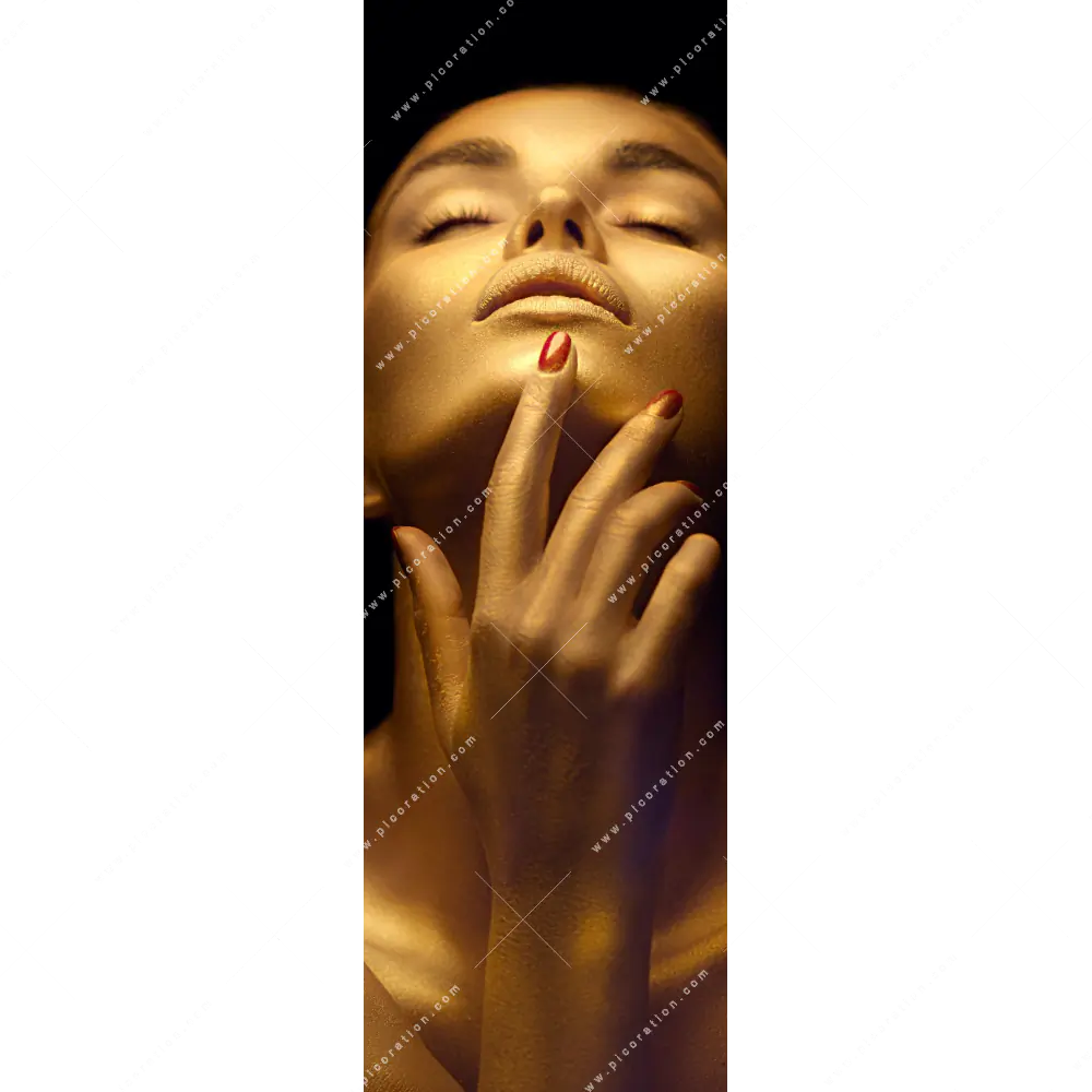 Bringen Sie Vielfalt in Ihren Raum mit unseren Textil-Ersatzdrucken für Ihr Wandbild im Panorama Hochformat. Insbesondere unser Golden Skin ist ein atemberaubendes Motiv, das zu jedem Stil passt und Ihrem Bar - Gastronomie, Friseur - Beauty, Wohnzimmer - Schlafzimmer neues Leben einhaucht. Mit dem Goldene Haut Textil-Ersatzdruck für Ihr Wandbild können Sie Ihre Räume hoch und beeindruckend erscheinen lassen. Das ist besonders bei flachen Räumen ein Vorteil, doch auch in hohen Räumen wirkt das Panorama-Hochformat mit dem Motiv Goldfrau aus der Kategorie Porträts - Menschen als besonderes Highlight. Raumcharakter und Widererkennungswert werden durch den Textil-Ersatzdruck mit dem Motiv Golden Woman in der Größe Maße besonders hervorgehoben und betont.