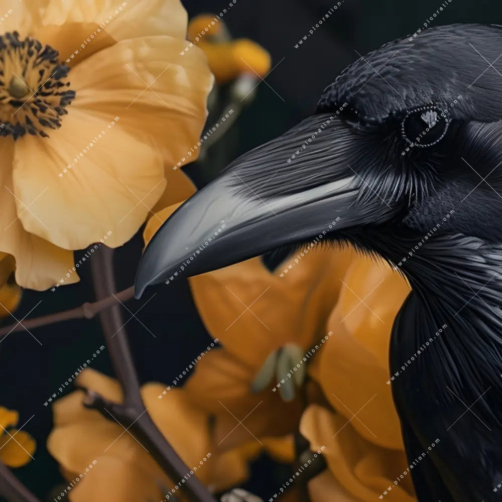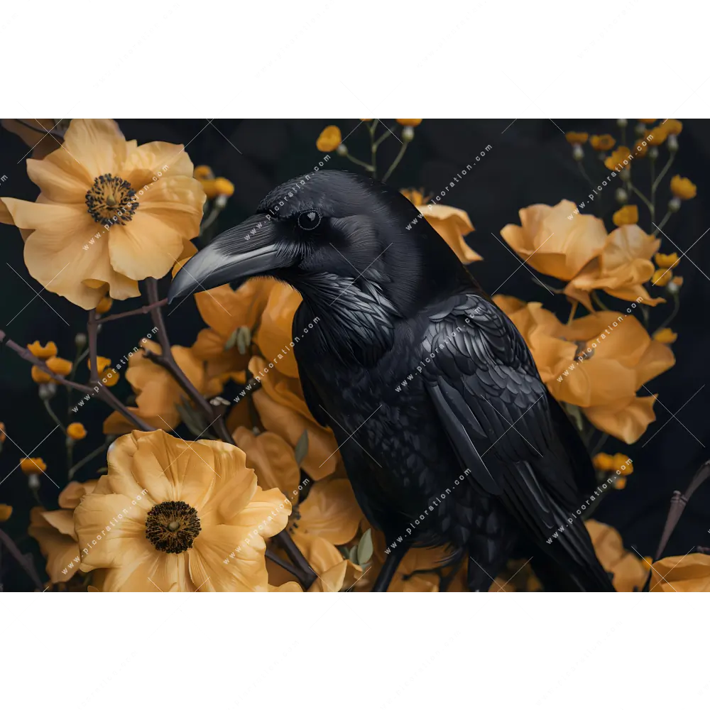 Rabenportrait vor gelben Blüten an Ihrer Wand – einfach als Textil-Ersatz-Bezug für Ihr Wandbild