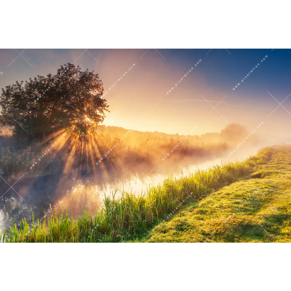 Unser Stoff-Ersatzmotiv Morgennebel am Wasser im Querformat sorgt durch die Farben Orange, Weiss, Blau, Braun, Bunt, Beige, Grün, Gold, Hellblau, Hellgrün, Ocker für eine gemütliche und ganz besondere Atmosphäre in Ihrem Raum. Schaffen Sie mit Ihrem neuen Wandbild-Motiv eine atemberaubende Wohlfühlatmosphäre!