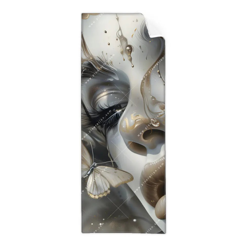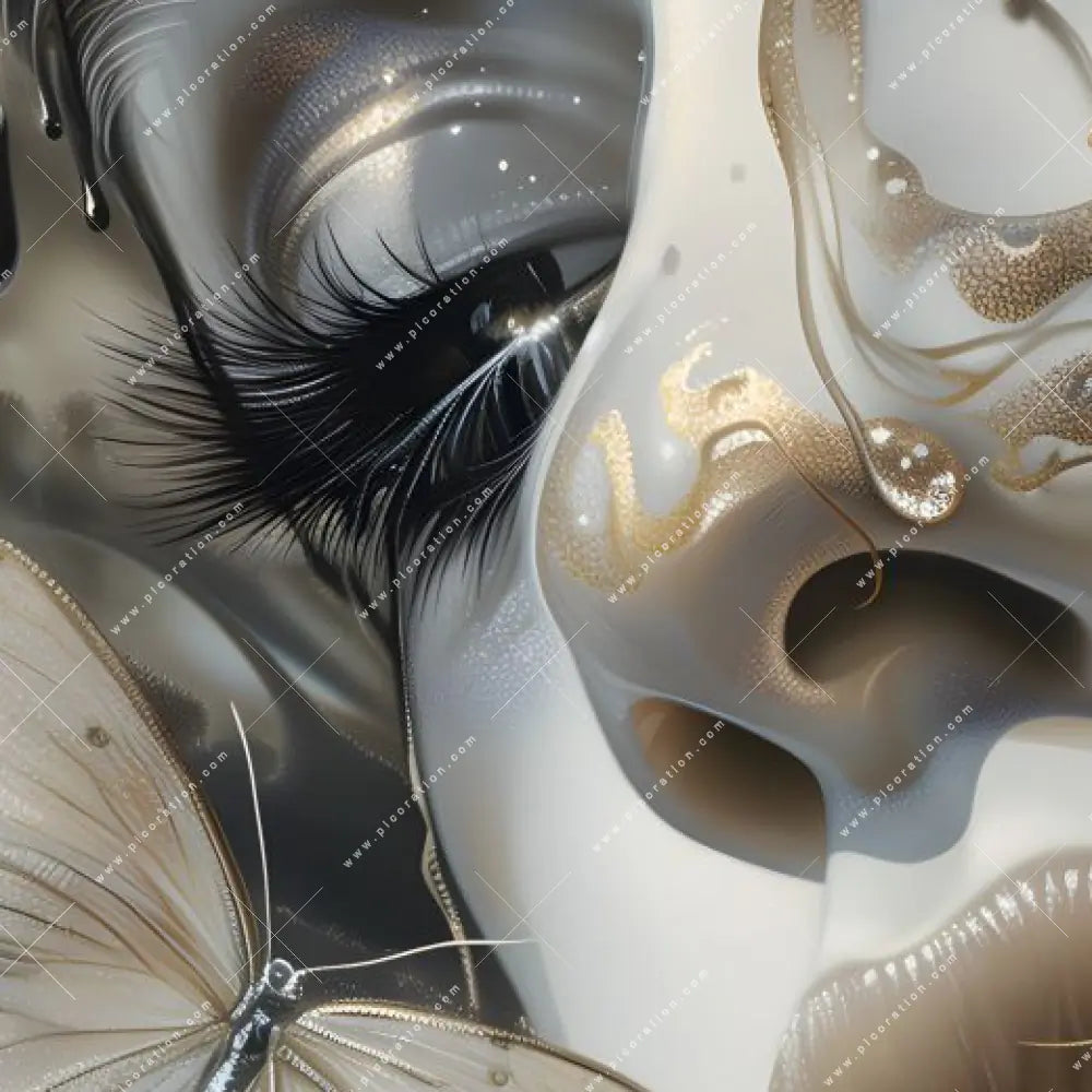 Paola - Porträt mit Schmetterlingen im Panorama-Hochformat verleiht Ihrem Raum eine gemütliche und gleichzeitig beeindruckende Atmosphäre, die Sie nicht mehr missen wollen. Die Farbgebung Gold, Grau , Schwarz, Beige sowie der Modern Art, Abstrakt Stil der Kunst - Malerei sorgen für ein harmonisches, atemberaubendes Bild an Ihrer Wand. Und das Ganze ist mit wenigen Handgriffen umgesetzt – tauschen Sie mit unserem Textilersatzdruck einfach und schnell Ihr Wandbild-Motiv und erleben Sie den neuen Charme Ihres Raumes. Porträt, Gesicht, Frau, Schmetterlinge, Frauenporträt, Fluid Art, Farbspritzer – alles ist in Ihrem neuen Motiv vereint.