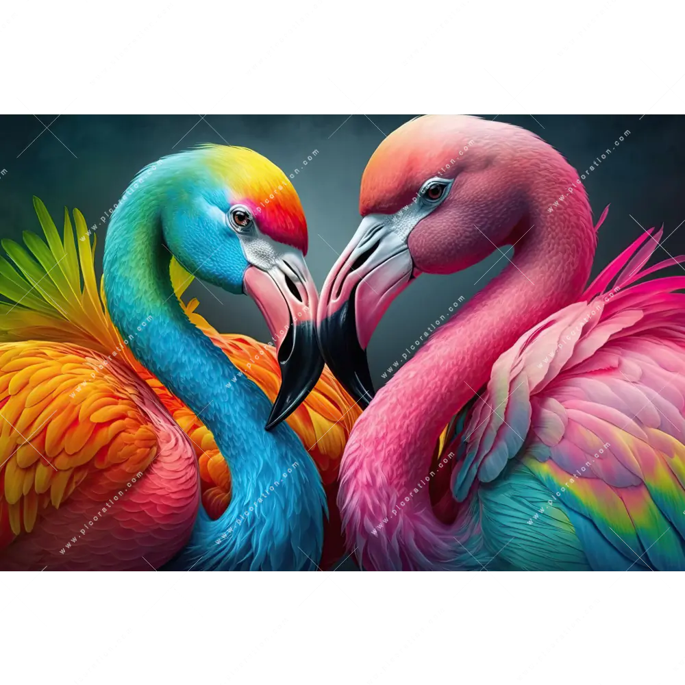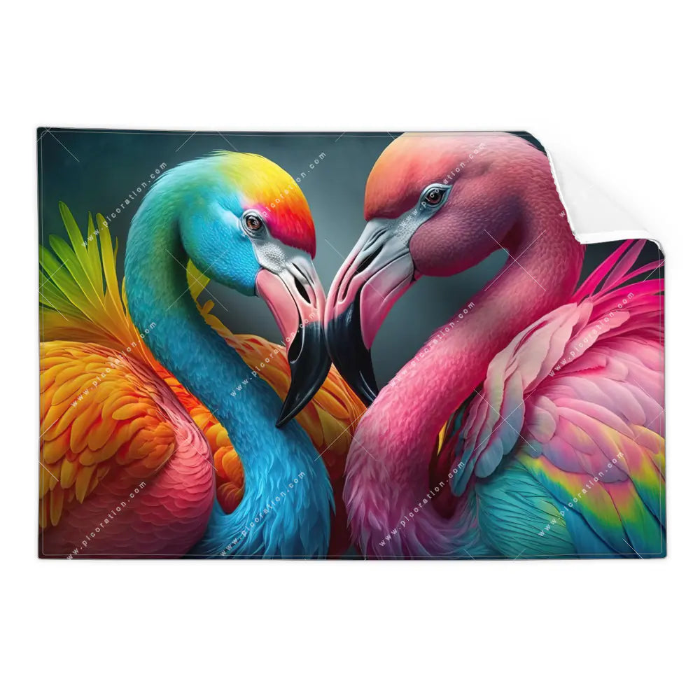 Unser Stoff-Ersatzmotiv Flamingos in buntem Gefieder im Querformat sorgt durch die Farben Pink, Blau, Orange für eine gemütliche und ganz besondere Atmosphäre in Ihrem Raum. Schaffen Sie mit Ihrem neuen Wandbild-Motiv eine atemberaubende Wohlfühlatmosphäre!