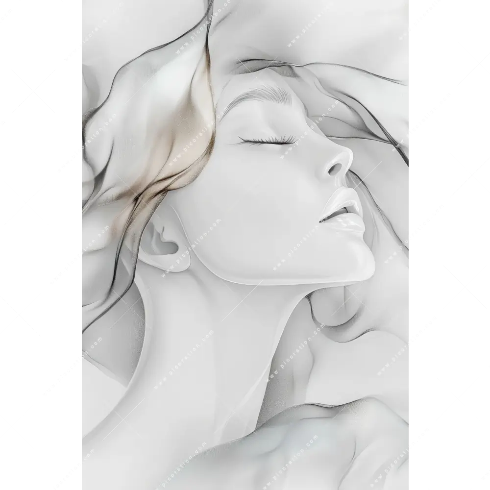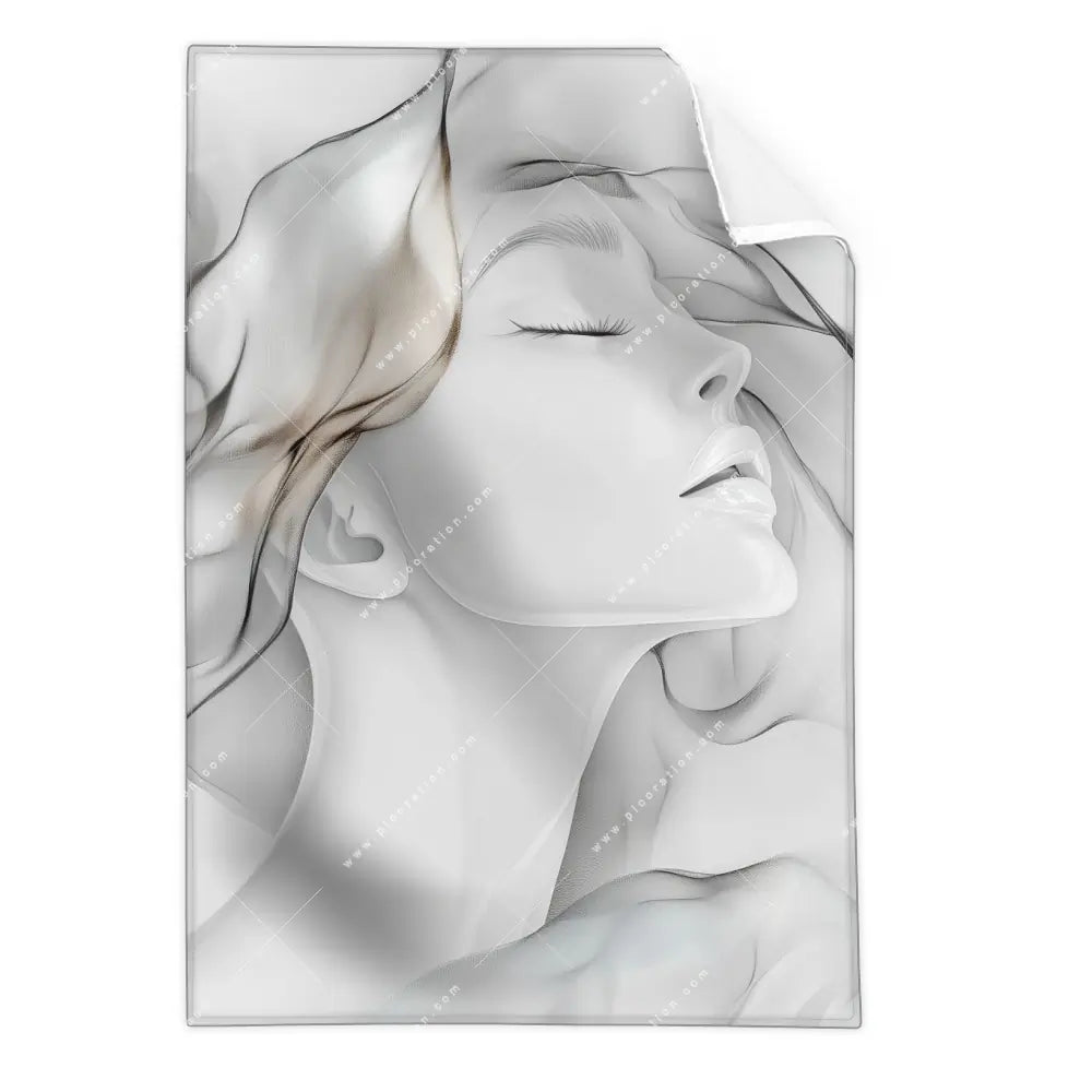 Das Wechselmotiv für Ihr Wandbild mit dem Motiv Weibliche Schönheit der Kategorie Porträts - Menschen ist eine ausgezeichnete Wahl, um eine harmonische Wohlfühlatmosphäre zu schaffen. Das Maße große Spannbild als Textil-Ersatzdruck passt perfekt in Ihr Wohnzimmer - Schlafzimmer, Friseur - Beauty, Flur - Eingangsbereich. Sowohl die Weiss, Grau Farbe als auch der Abstrakt, Minimalistisch Stil der Digitale Kunst, Vektor - Illustration sind aufeinander abgestimmt, sodass das Wandbild mit Ihren Möbeln und Ihrer Innenausstattung im Einklang ist. Frau, Gesicht, Portrait, Mädchen, Dame, Schönheit, Wellen, Schwung, Linien – alles in Ihrem neuen Motiv vereint - lässt Erholung und Entspannung wieder frisch aufleben und setzt Ihrem Raum auch dieses Mal ein einzigartiges Highlight. Bringen Sie in Sekunden Frische in Ihre Räume und erleben Sie neue aufregende Welten mit einem Textil-Ersatzdruck für Ihr Spannbild im Hochformat.