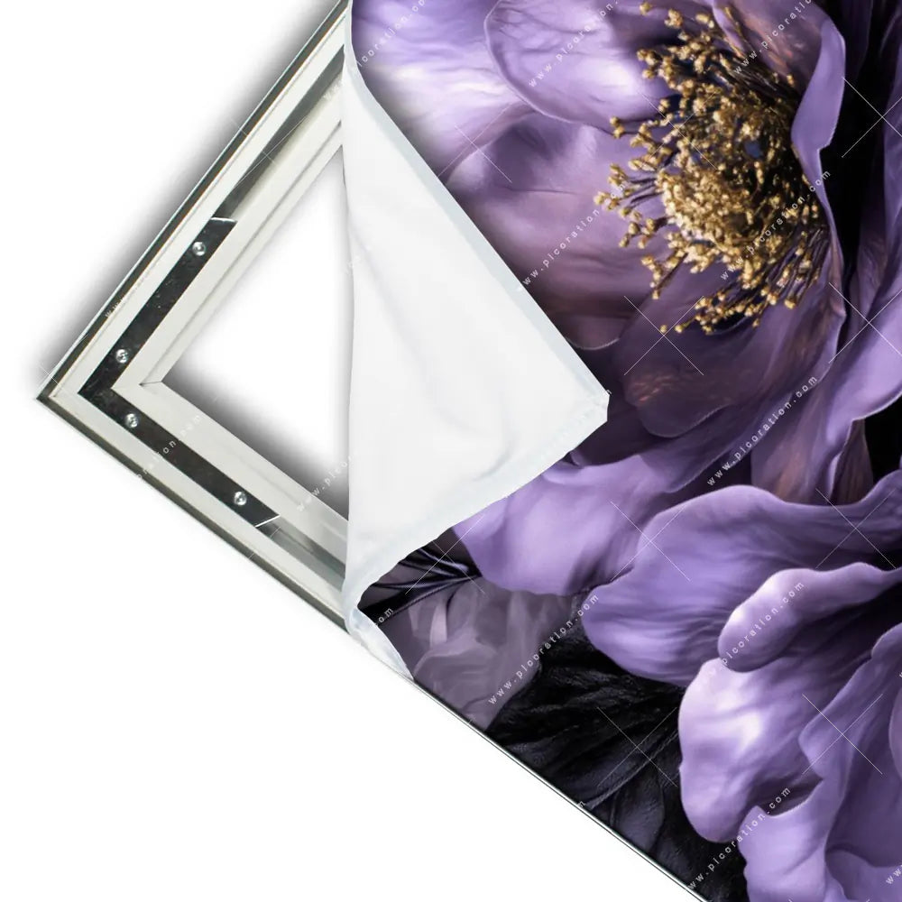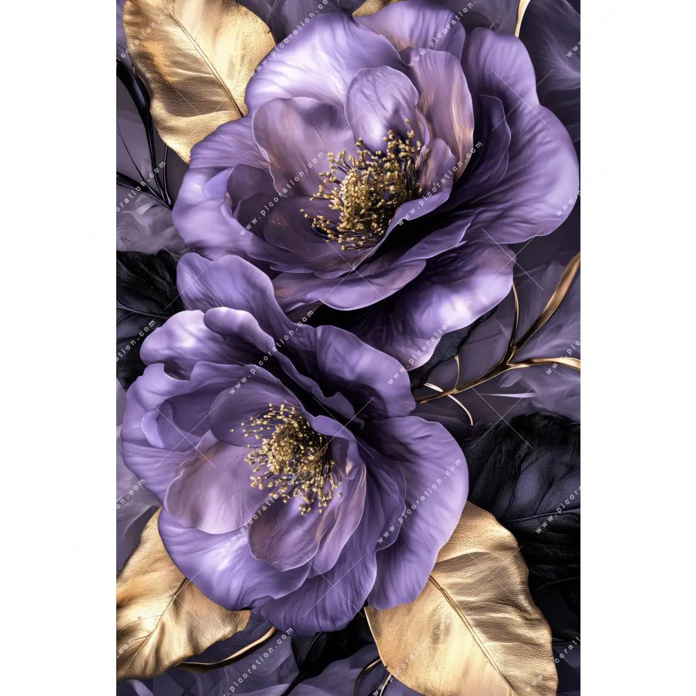 Insbesondere das XXL Wandbild Lila Blüten mit Goldakzenten im Floral, Retro - Vintage Stil der Digitale Kunst schafft auf den hochwertigen Materialien unserer XXL Wandbilder eine hohe Bildqualität und beeindruckende Wirkung. Lassen Sie sich in der Schwarz, Lila, Gold Farbgebung des Motivs Violette Goldblüten von dessen Wirkung als XXL-Wandbild verzaubern und genießen Sie die neue Wirkung Ihres Raumes. Pflanze, Natur, Nahaufnahme, Draufsicht, vintage, Blumen, Rosen, Blüten, Pfingstrosen werden in diesem XXL-Wandbild vereint und schaffen eine einmalige Atmosphäre.