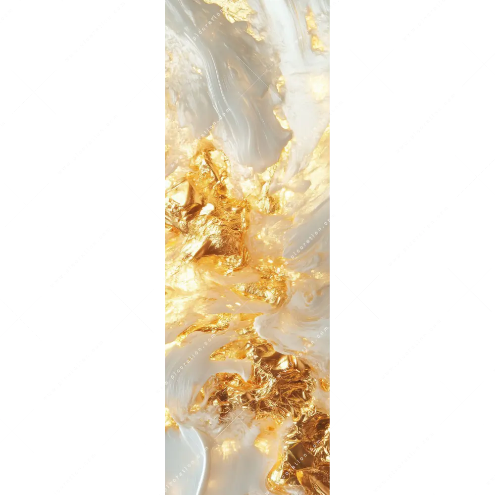 Das XXL Wandbild wird mittlerweile oft als Ersatz für das traditionelle Gemälde verwendet. Insbesondere das XXL-Wandbild Abstrakte goldene Strömung wirkt in der Größe Maße durch das beeindruckende Panorama-Hochformat als einzigartiges Meisterwerk. Die Farben Gold, Weiss als auch der Abstrakt, Modern Art Stil kommen in diesem Format besonders zur Geltung und es entsteht eine einmalige Wirkung des XXL-Wandbildes Abstrakte goldene Strömung.