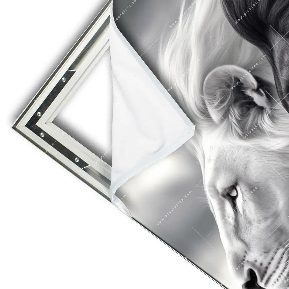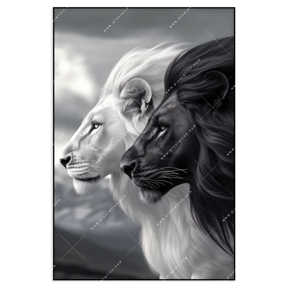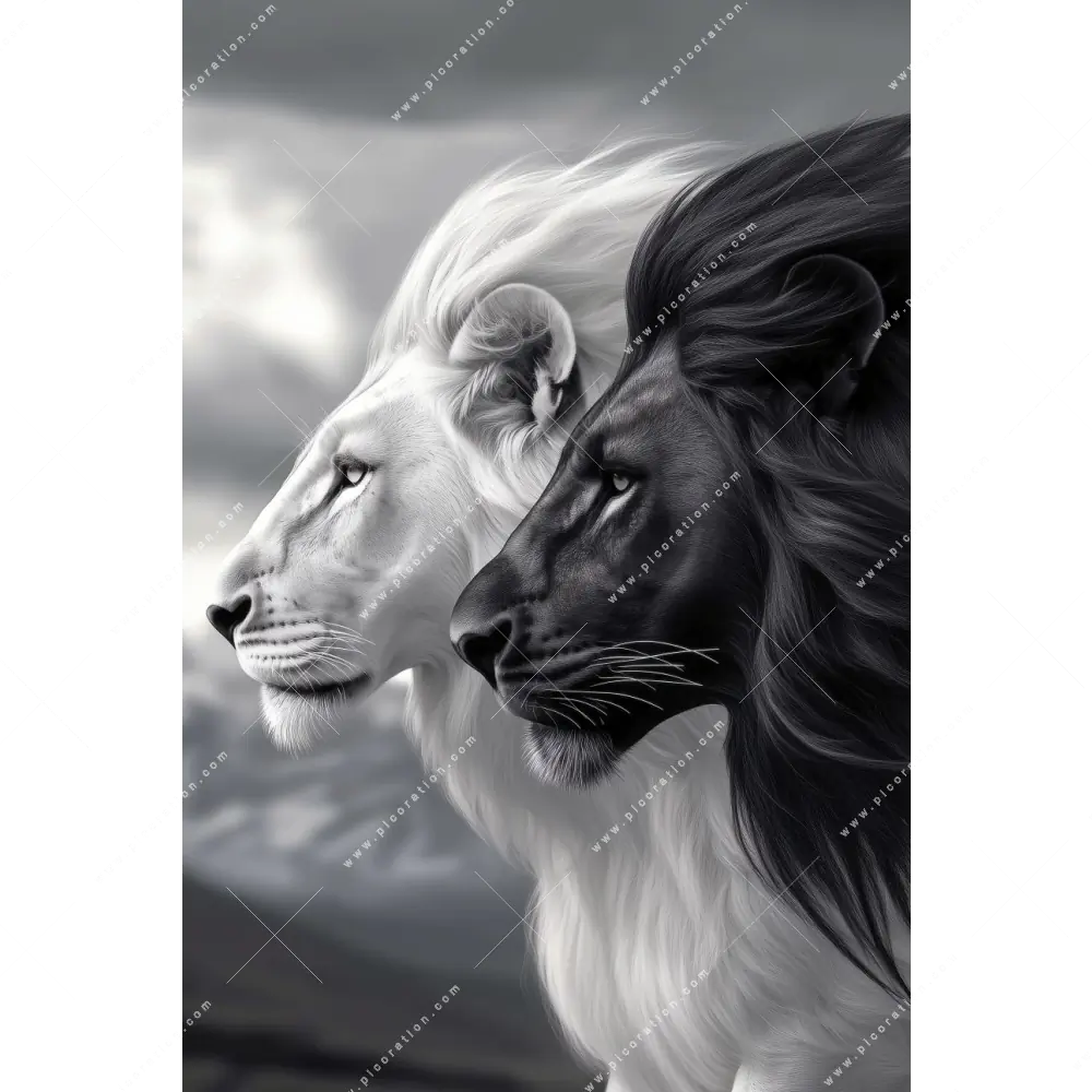 Das XXL Wandbild Löwen Yin Yang der Kategorie Tierwelt im Hochformat ist ein beeindruckender Blickfang in Ihrem Büro - Kanzlei, Wohnzimmer - Schlafzimmer, Flur - Eingangsbereich. Je nach Größe Maße kann es ein wandfüllendes Kunstwerk werden oder einen Akzent setzen. Gerade in größeren Räumen, wie Wohn-, Empfangs- oder Besprechungsräumen, bietet sich das Hochformat an, um die Architektur zu betonen und den Raum zu füllen. Es lässt den Raum höher und beeindruckend erscheinen und schafft eine angenehme und inspirierende Atmosphäre.