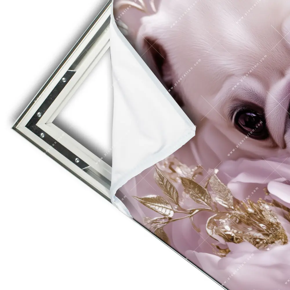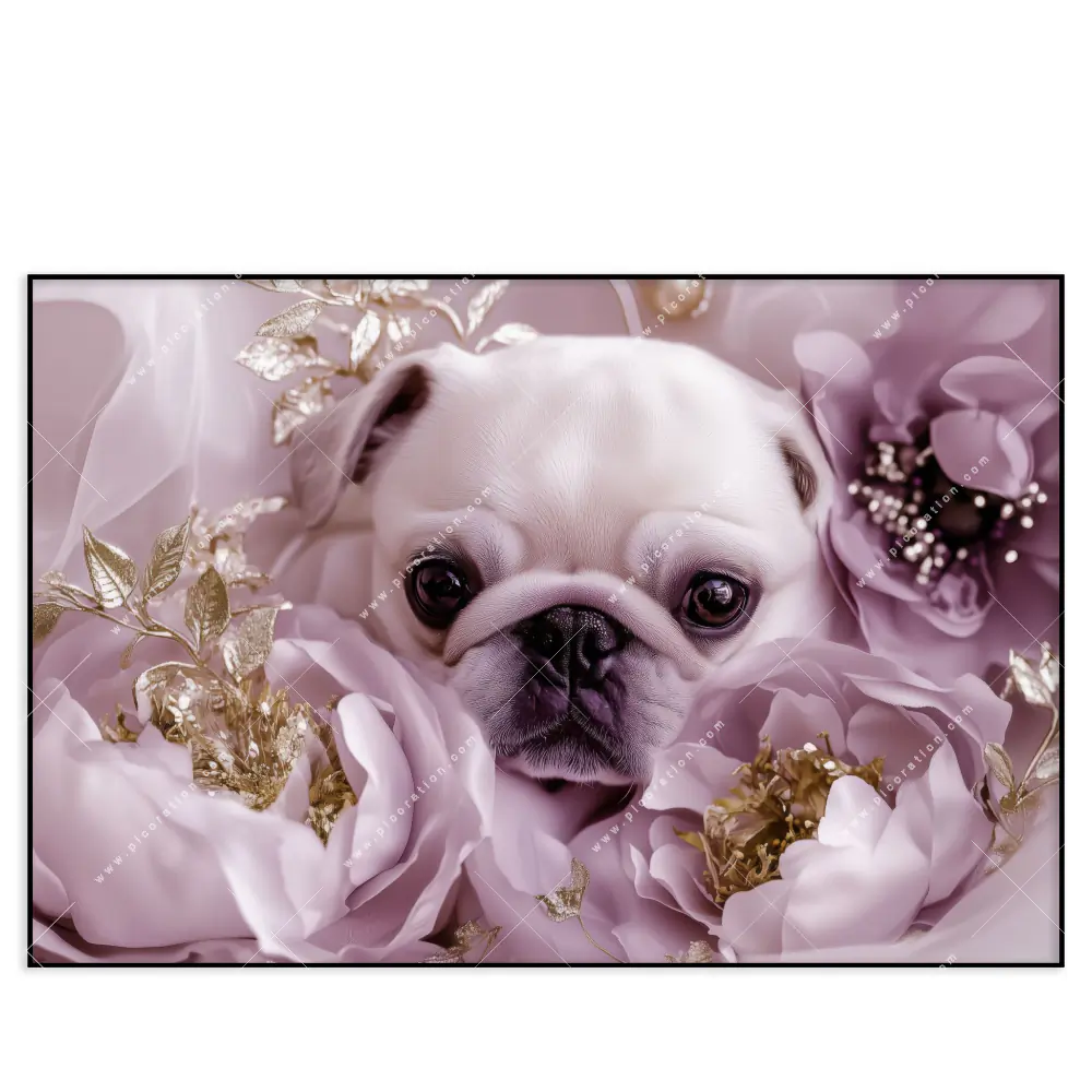 Beeindruckendes XXL Wandbild mit dem Motiv Mops im Blütenmeer