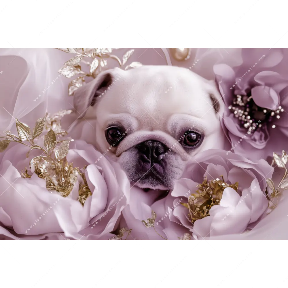 Das Wandbild mit dem Motiv Blumiger Hundeglanz aus der Kategorie Tierwelt, Blumen - Botanik erwirkt in der Größe Maße einen ganz besonderen Eindruck auf den Betrachter und erschafft eine neue Raumwirkung, denn Tier, Hund, Welpe, Mops, Tierporträt, Blumen, Blüten vereinen sich in diesem Wandbild im XXL-Format. Dieses XXL Wandbild ist ein Statement und ein Eyecatcher, den man nicht übersehen kann.