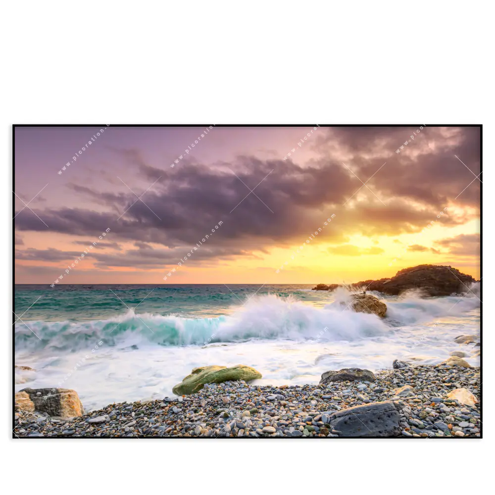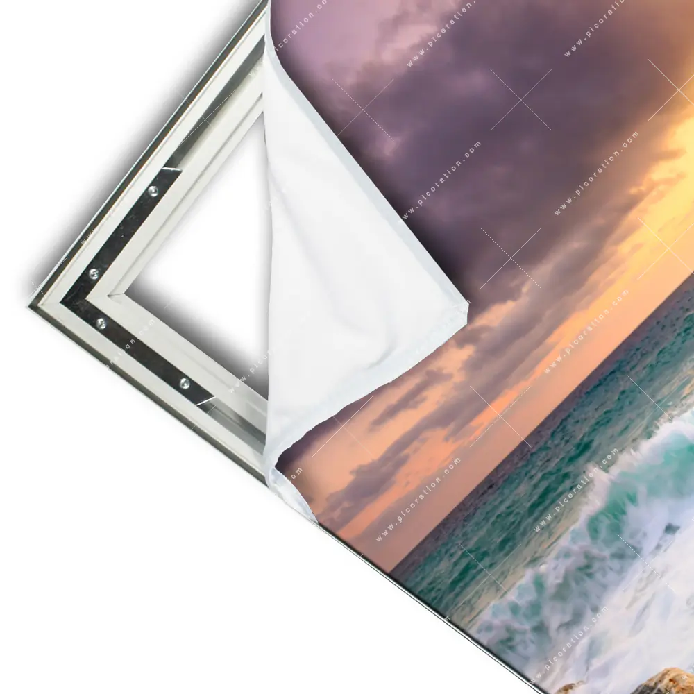 Das XXL Wandbild Kraft der Wellen ist ein beeindruckendes und atemberaubendes Kunstwerk mit dem Natürlich - Realistisch, Modern Art Stil der Fotografie, Digitale Kunst, das eine starke visuelle Wirkung erzielt und zu einem Blickfang in jedem Raum wird. Das Wandbild im XXL-Format hat durch seine textile Oberfläche eine hohe Farbkraft, wodurch die Lila, Orange, Türkis Farbgebung noch mehr zur Geltung kommt.