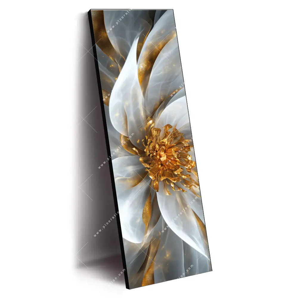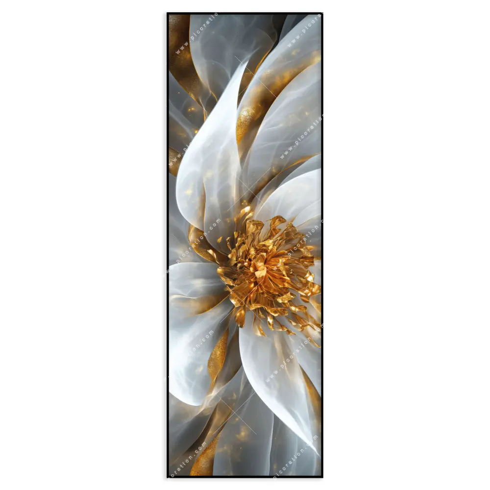Das XXL Wandbild wird mittlerweile oft als Ersatz für das traditionelle Gemälde verwendet. Insbesondere das XXL-Wandbild Strahlende Blütenkunst wirkt in der Größe Maße durch das beeindruckende Panorama-Hochformat als einzigartiges Meisterwerk. Die Farben Weiss, Gold als auch der Floral, Modern Art Stil kommen in diesem Format besonders zur Geltung und es entsteht eine einmalige Wirkung des XXL-Wandbildes Strahlende Blütenkunst.